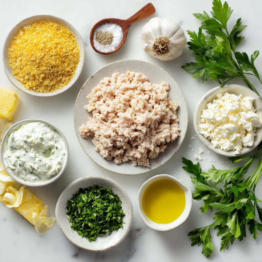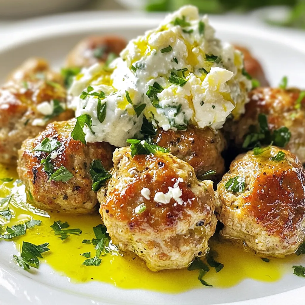 Ground chicken is the star of this dish. It is lean and tender. Fresh herbs and spices give these meatballs their Greek flair. Feta cheese adds a creamy bite, while breadcrumbs help bind the meatballs. Tzatziki sauce, a cool yogurt dip, adds flavor and moisture. Garlic, oregano, and lemon zest bring a fresh taste. Be sure to season with salt and pepper for balance.