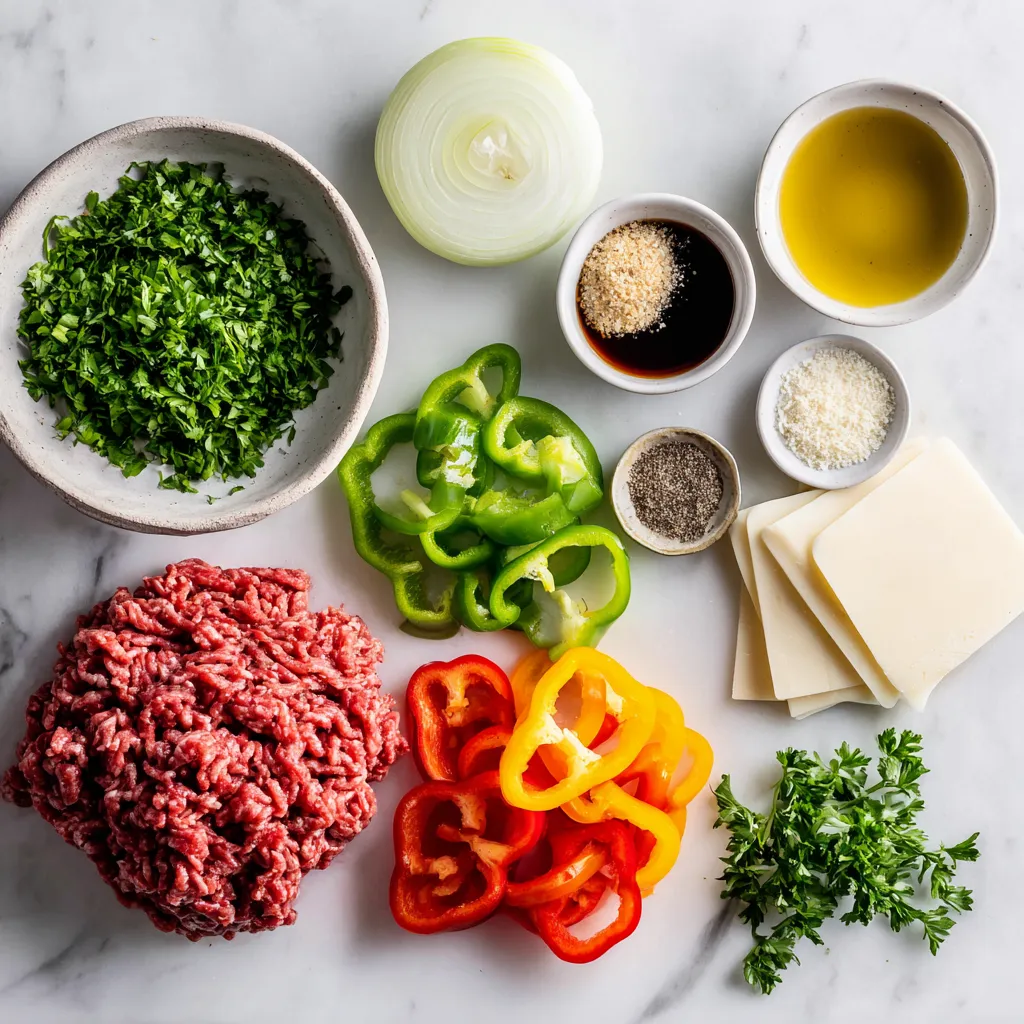 When I make my Ground Beef Philly Cheesesteak Skillet, I love to gather all my ingredients first. This way, I can enjoy the cooking process without rushing. Here’s what you need: