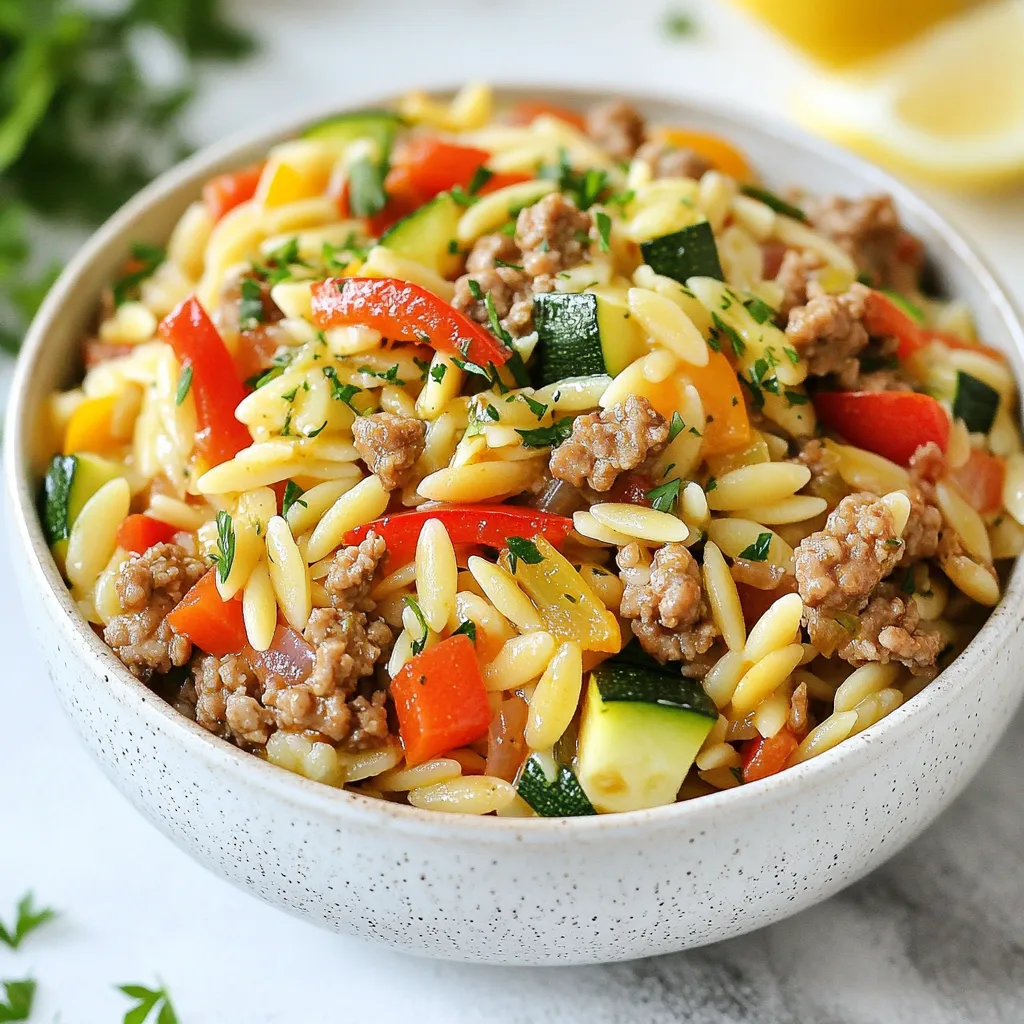 A savory dish featuring ground turkey and orzo pasta, combined with fresh vegetables and spices.
