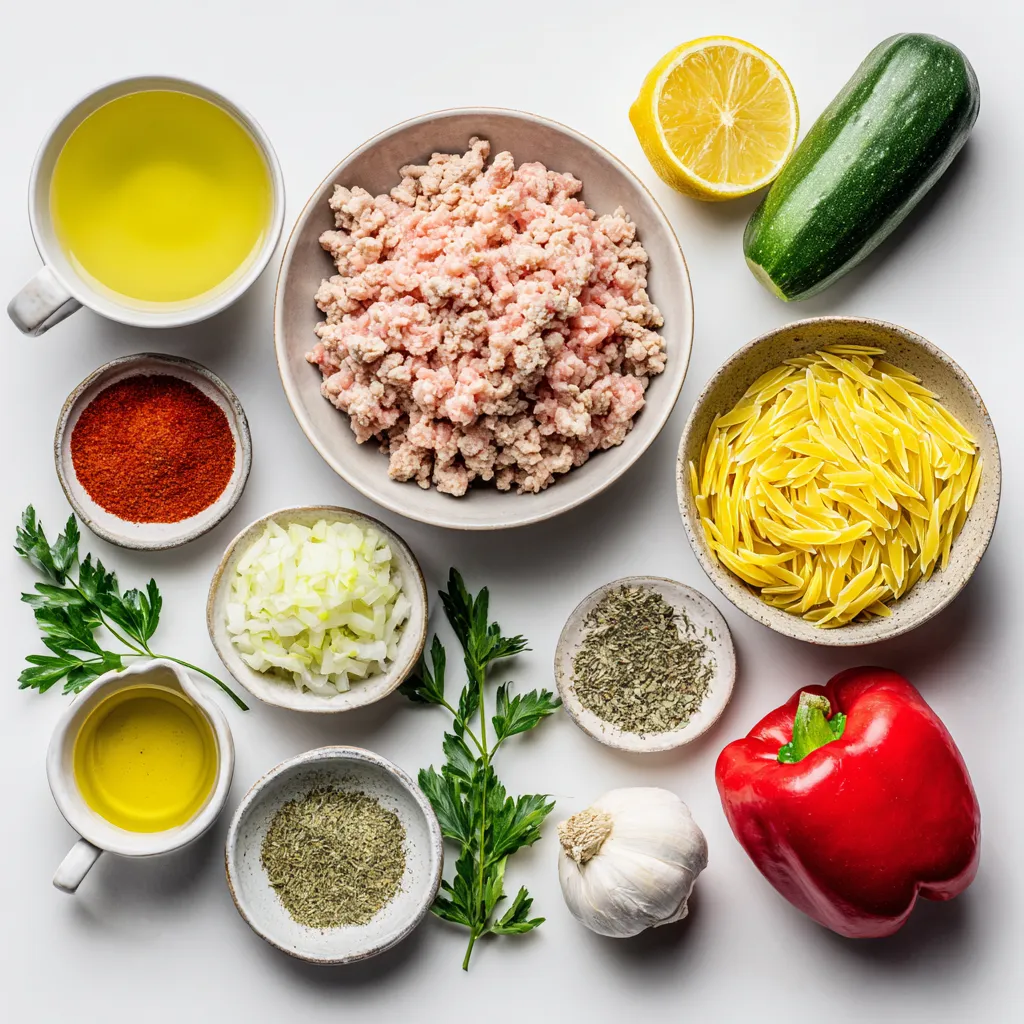 The star of this dish is the ground turkey. It is lean and full of flavor. Orzo pasta is like little rice grains but with a pasta twist. The mix of onion, garlic, bell pepper, and zucchini adds color and crunch. These veggies bring a fresh taste to the meal.