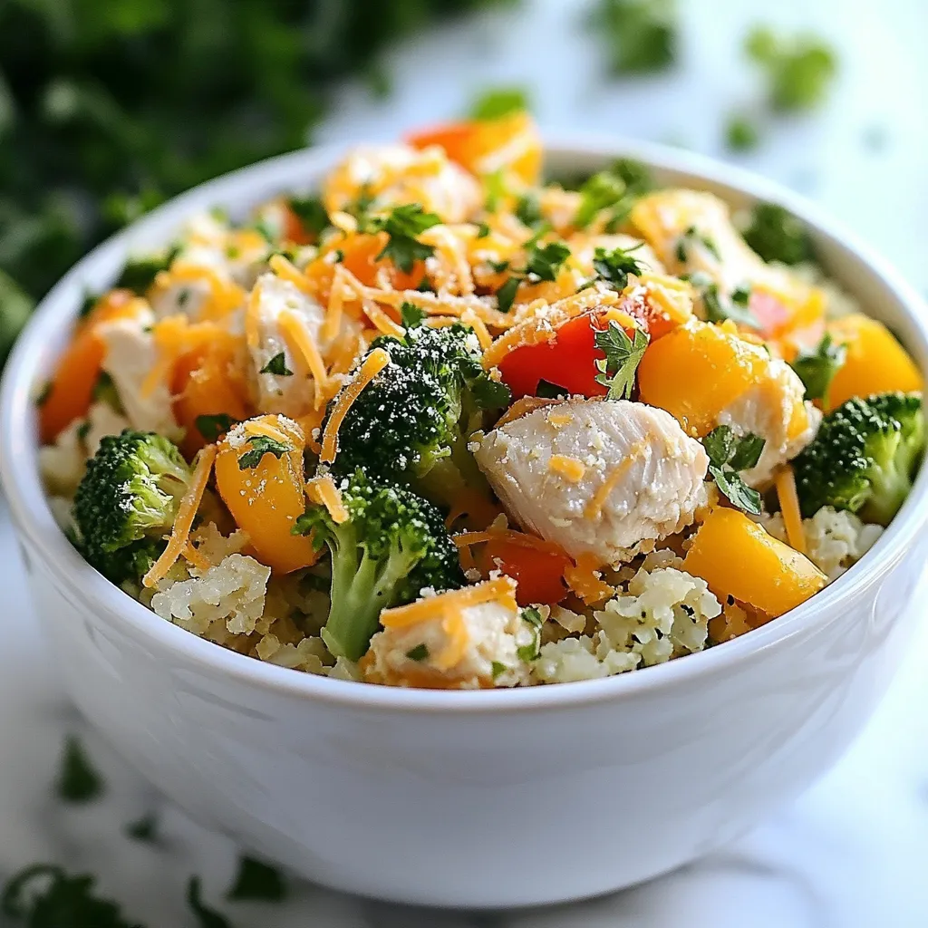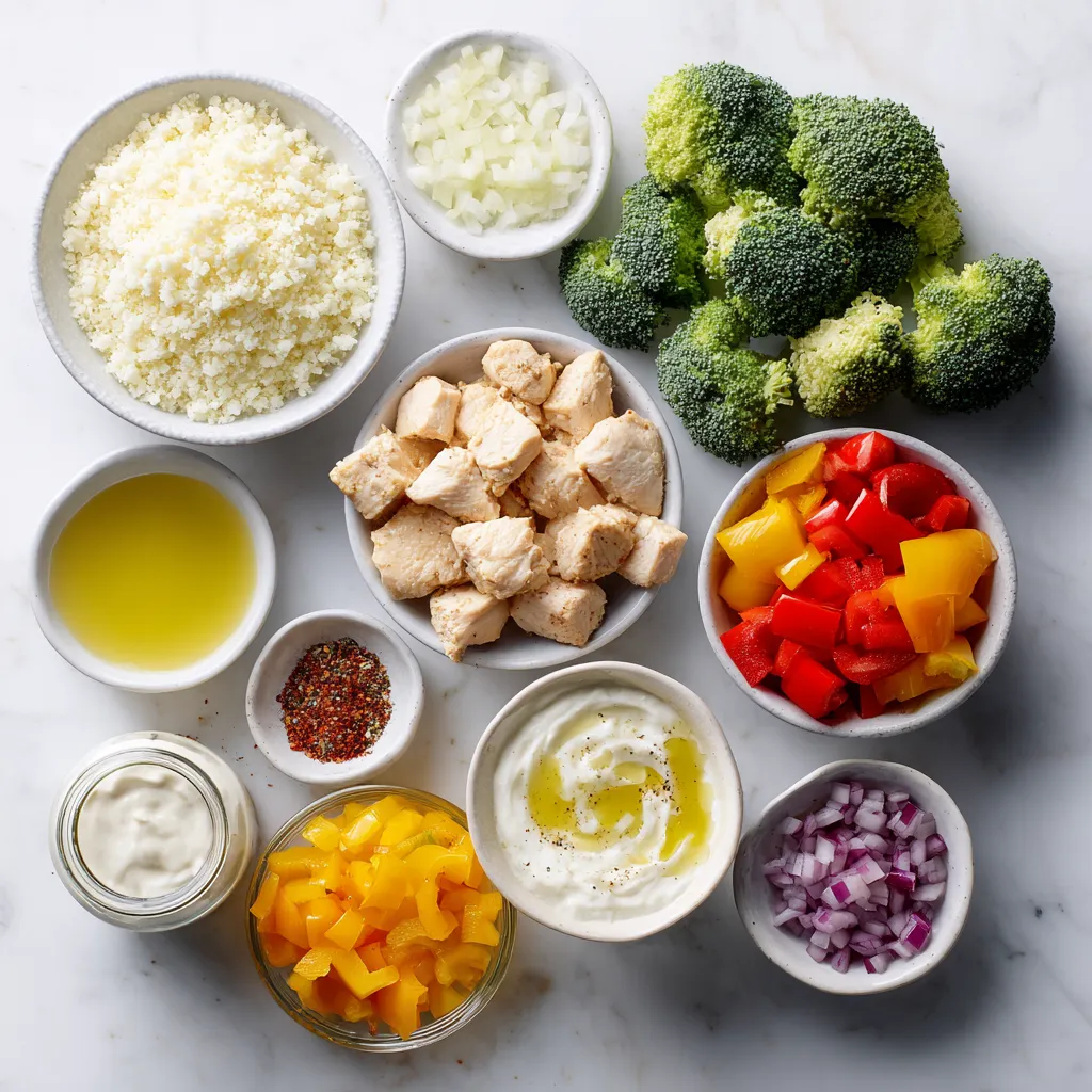 Each ingredient adds flavor and nutrition. Cauliflower rice serves as a low-carb base. Chicken breast provides protein. Broccoli and bell peppers add color and vitamins. Onion and garlic bring depth to the dish. Chicken broth keeps it moist. Greek yogurt adds creaminess. Seasonings like oregano and paprika enhance taste. You can top it with cheese for extra richness.
