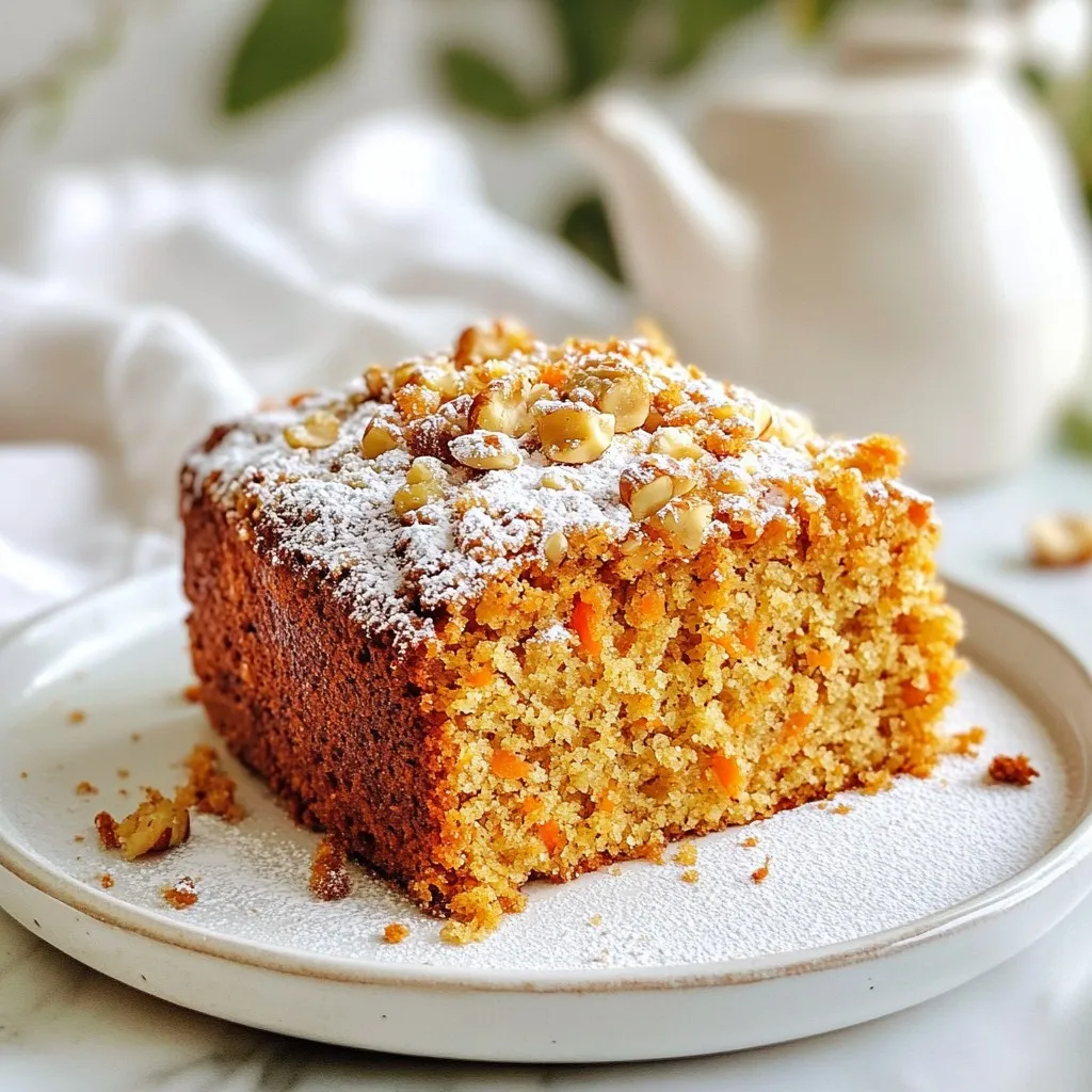 Presentation makes a cake look special. Dust the cooled cake with powdered sugar. You can add grated carrots and nuts on top for fun. Serve slices with Greek yogurt for creaminess. This makes it more appealing and tasty!