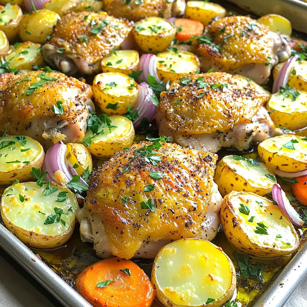 These main ingredients come together to create a hearty and tasty dish. The chicken thighs give a rich flavor and juicy texture. Baby potatoes add a nice, creamy bite. Carrots and red onions bring a touch of sweetness and color to the meal.