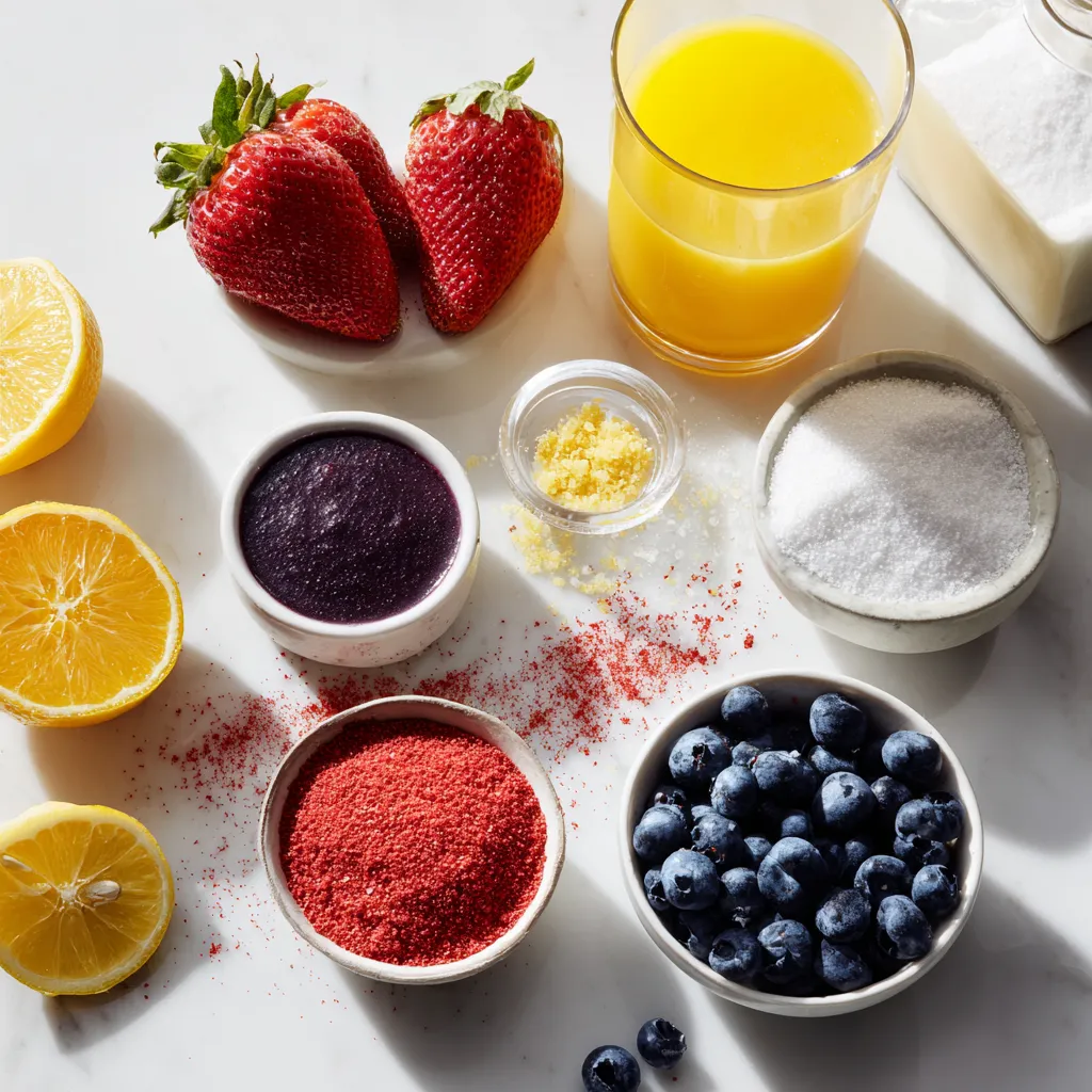 Fresh fruit brings bright flavors to your sherbet. Use ripe oranges, strawberries, and blueberries for the best taste. The coconut milk adds creaminess without dairy. Granulated sugar sweetens each layer, making it delightful. Lemon juice brightens up the flavors.
