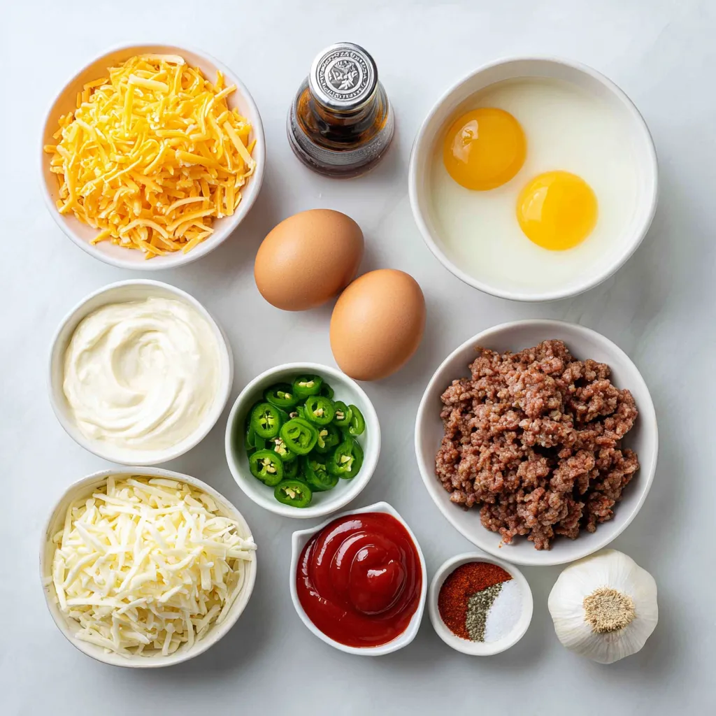 Gather these ingredients to create a spicy and cheesy meatloaf. The ground beef forms the base. Breadcrumbs give it texture, while eggs hold it all together. Cream cheese adds creaminess, making every bite rich.