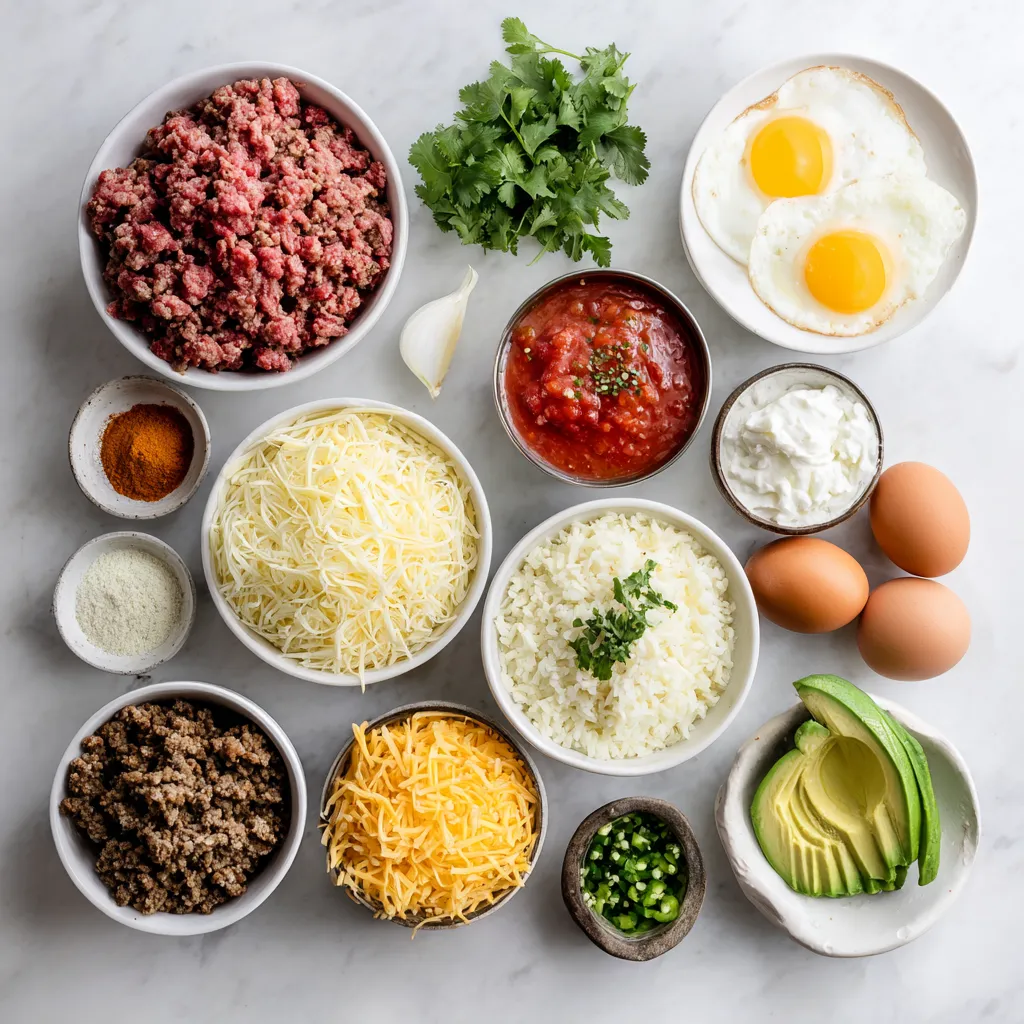 The main ingredients in Keto Taco Pizza Casserole are key for flavor. Ground beef or turkey gives the dish its hearty base. Use diced onions and minced garlic for a savory kick. Taco seasoning adds bold flavors, enhancing the overall taste.
