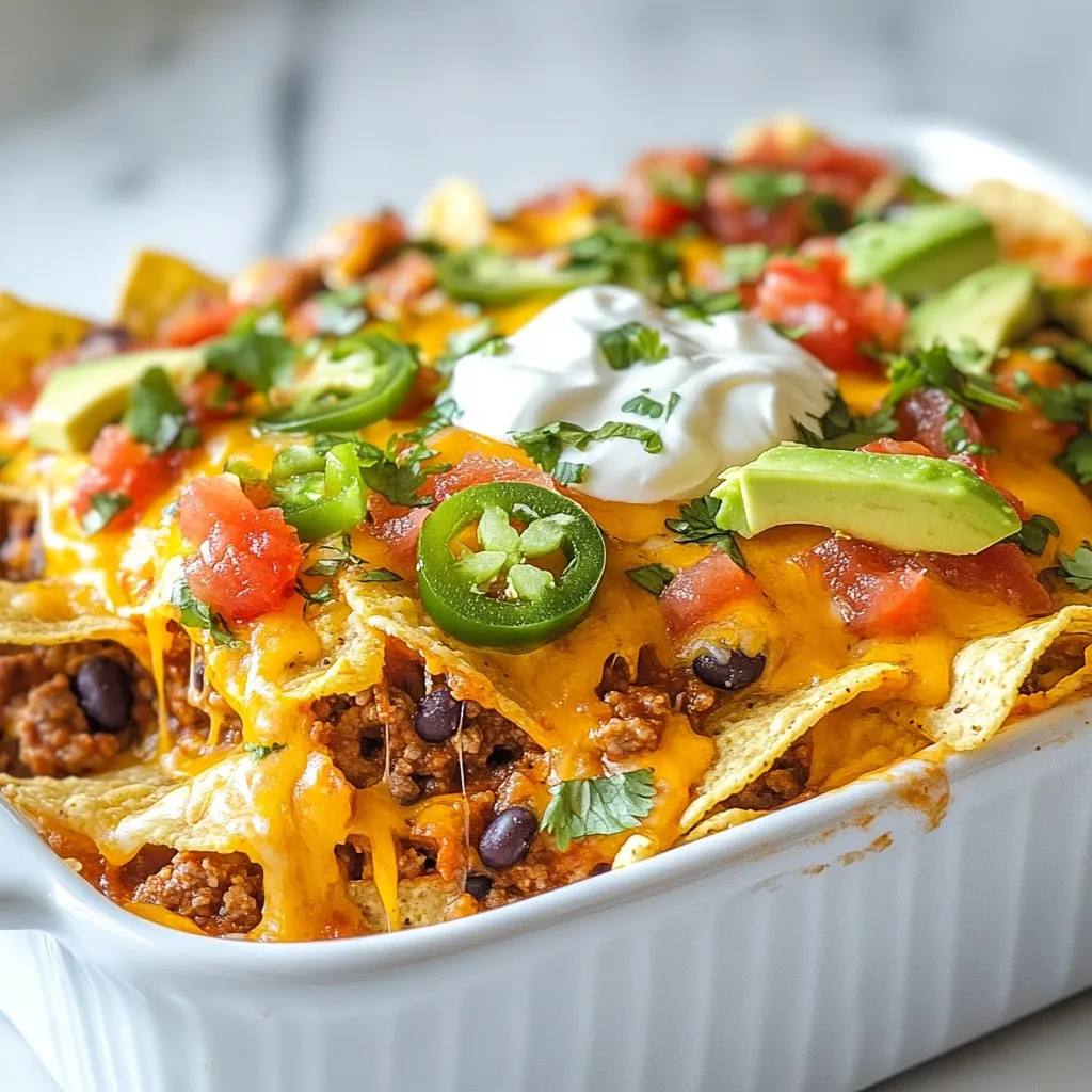 A delicious and hearty casserole layered with tortilla chips, seasoned meat, and melted cheese, topped with fresh garnishes.