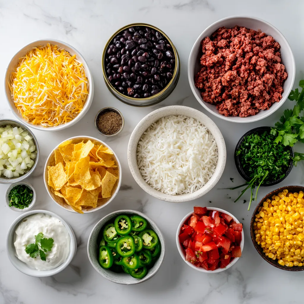 Each ingredient plays a key role in creating layers of flavor. The ground beef gives a hearty base. Onions and garlic add a sweet touch. Taco seasoning brings the zest, while beans and corn provide texture. The rice binds it all together. Toppings like cheese and chips make it fun and crunchy. Jalapeños can add heat, and cilantro gives freshness. This combo makes for a tasty family dinner.
