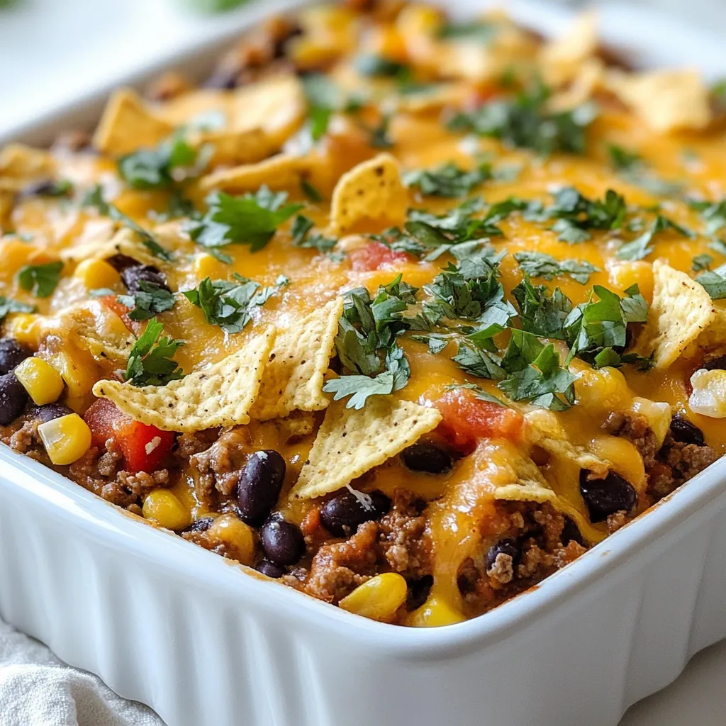 A delicious and hearty casserole loaded with taco flavors, beef, cheese, and topped with crunchy tortilla chips.