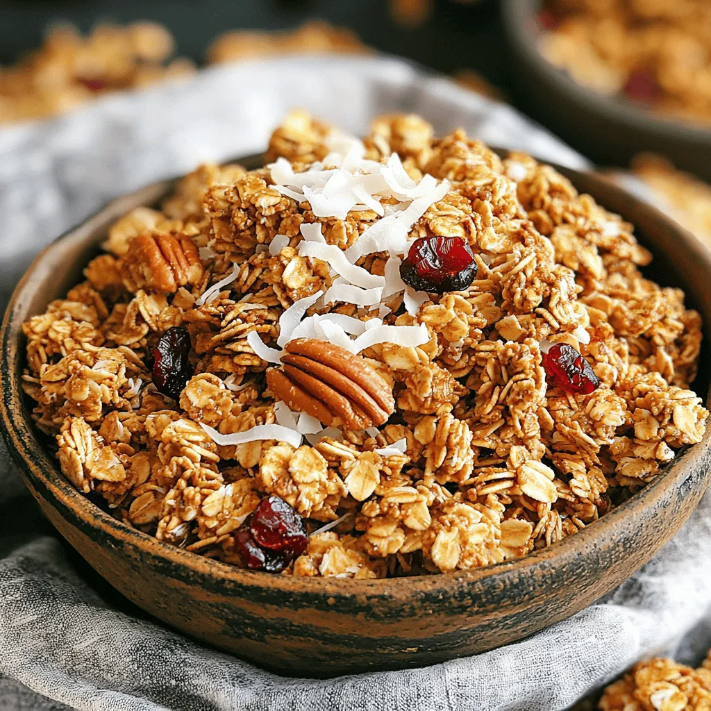 Cinnamon brings warmth that pairs well with maple syrup. The salt balances the sweet flavors perfectly. Maple syrup acts as a natural sweetener and binder, while melted coconut oil helps everything stick together. Finally, vanilla extract gives a lovely aroma and taste. If you like, toss in dried cranberries or raisins for a chewy surprise.