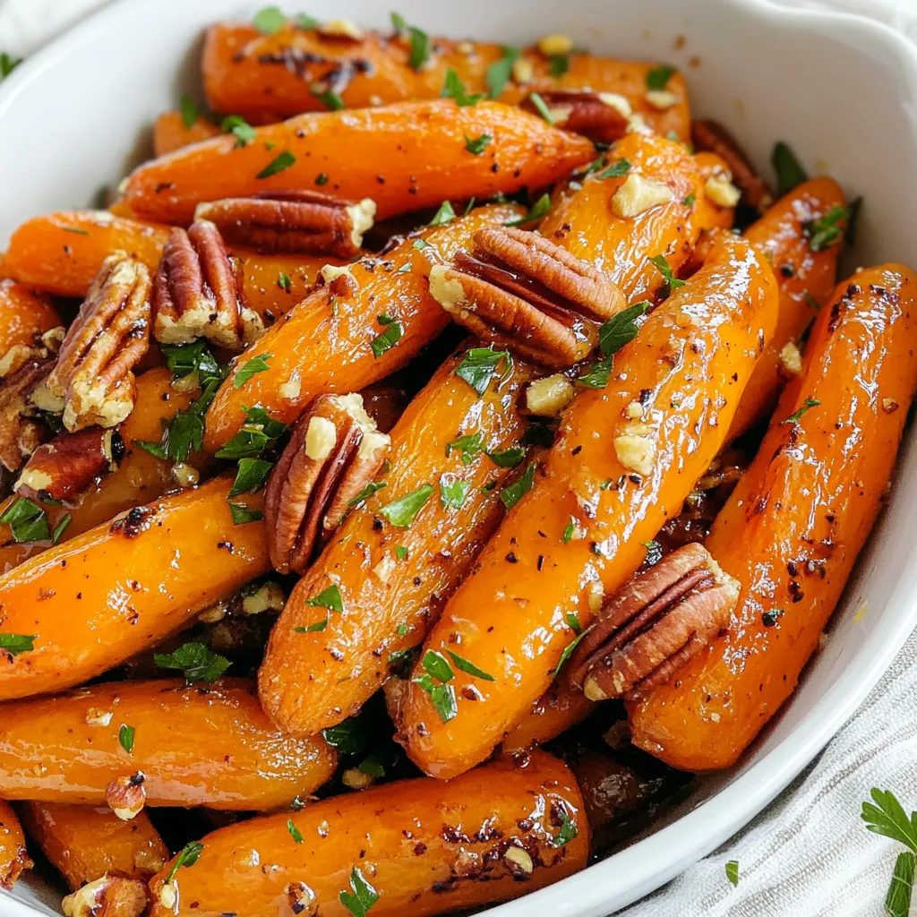 A delicious side dish featuring roasted carrots tossed in maple syrup and pecans.