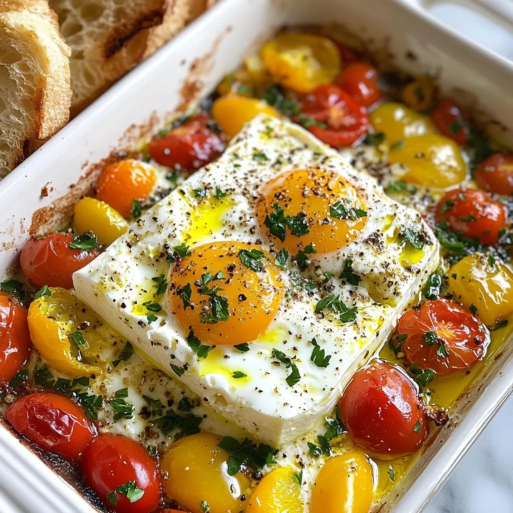 A delicious baked dish featuring feta cheese, cherry tomatoes, and eggs, perfect for breakfast.