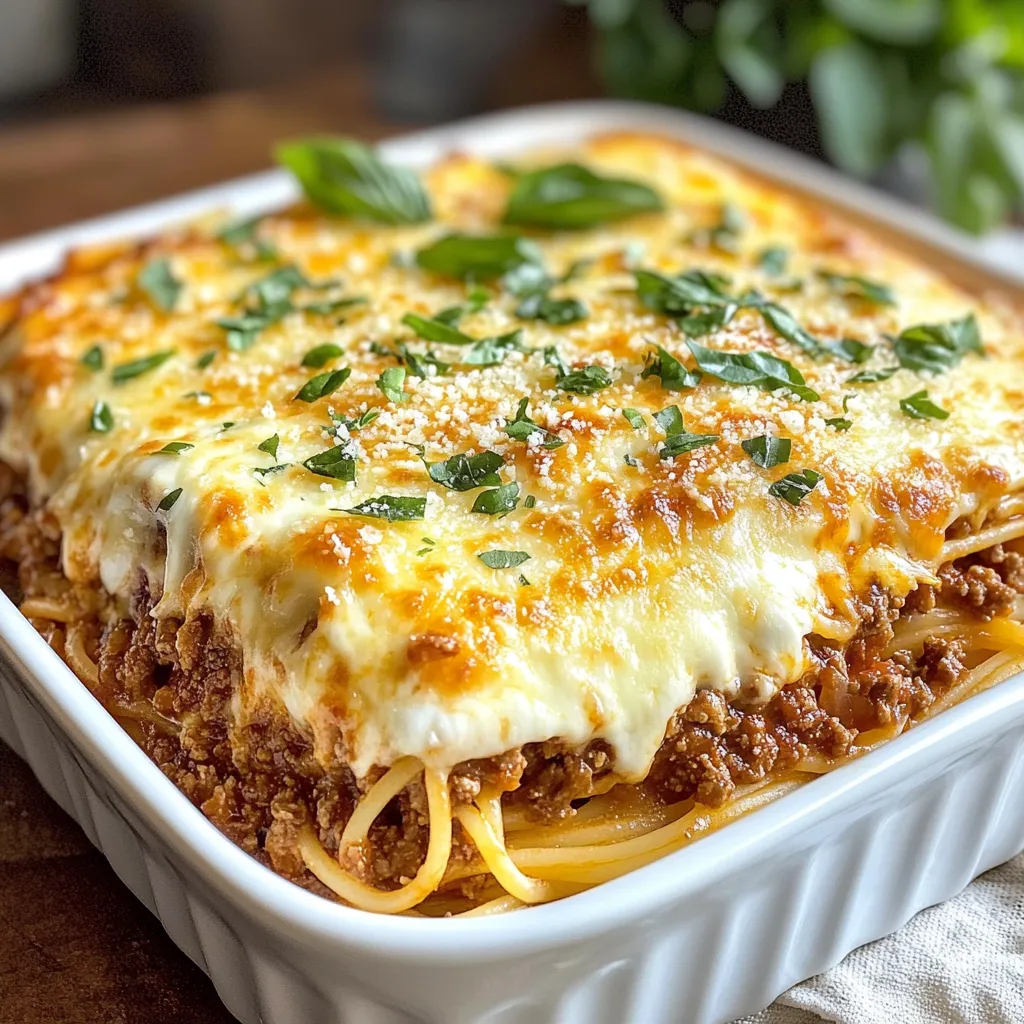 A delicious baked spaghetti dish layered with meat sauce and cheeses.