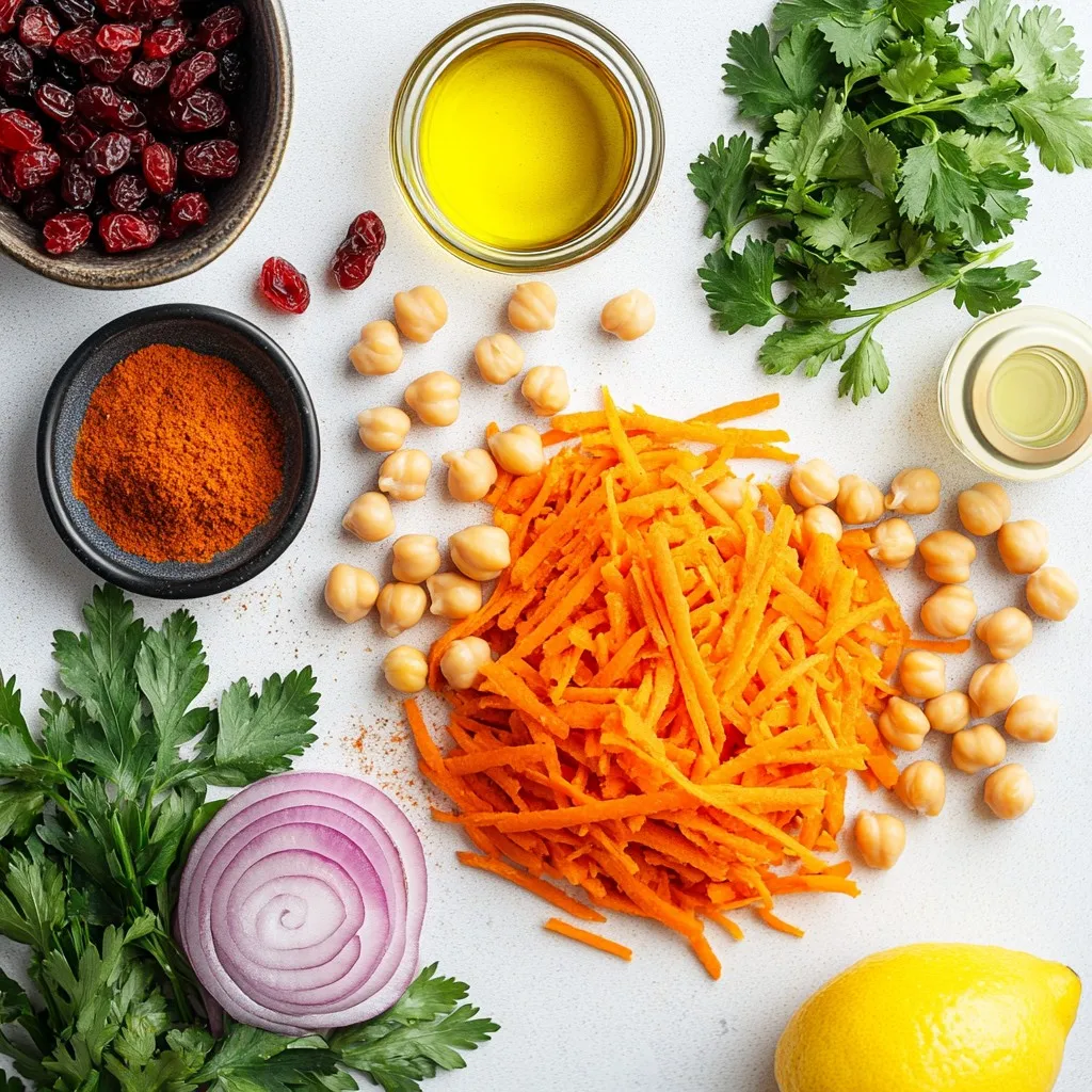 The ingredients for Moroccan Carrot Chickpea Salad bring bright colors and flavors. The carrots provide crunch, while chickpeas add protein.