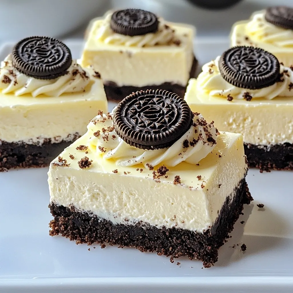 Delicious and easy-to-make cheesecake bars with a creamy Oreo filling and a crunchy crust.