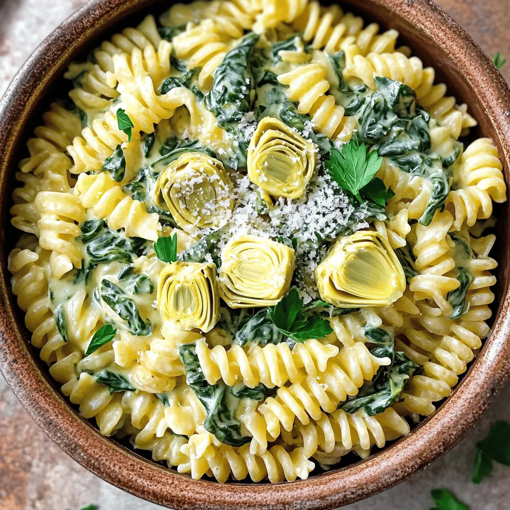 - 12 oz pasta (fusilli or penne) - 1 tablespoon olive oil - 3 cloves garlic, minced - 1 can (14 oz) artichoke hearts, drained and quartered - 4 cups fresh spinach - 1 cup heavy cream or coconut cream - 1 cup vegetable broth - 1 cup grated Parmesan cheese or nutritional yeast - 1 teaspoon Italian seasoning - Salt and pepper to taste - Fresh parsley for garnish Gather these ingredients before you start. They create a rich and tasty dish. The pasta is the base. Use fusilli or penne for great texture. Olive oil adds flavor and helps cook the garlic. Garlic brings a warm aroma, making your kitchen smell delightful. Artichoke hearts give a unique taste. They pair well with the creamy sauce. Fresh spinach adds color and nutrients. You can use heavy cream for richness. If you prefer a dairy-free option, coconut cream works perfectly. Vegetable broth enhances the flavor of the sauce. Parmesan cheese adds a salty kick. If you avoid dairy, try nutritional yeast for a cheesy flavor. Italian seasoning ties all the flavors together. Lastly, salt and pepper bring balance. Fresh parsley makes the dish pop with color. It’s not just for looks; it adds fresh taste too. Now you have everything you need for your creamy spinach artichoke pasta. Get ready to cook and enjoy! Start by gathering your ingredients. You need 12 ounces of pasta, 1 tablespoon of olive oil, and 3 cloves of garlic. Mince the garlic finely. Next, drain the can of artichoke hearts and cut them into quarters. Set these aside. Now, it's time to cook the garlic. Heat the olive oil in a large pot over medium heat. Add the minced garlic and sauté for about one minute. You want it fragrant, but be careful not to let it brown. This step adds a rich flavor to your dish. After the garlic is ready, add the artichokes to the pot. Sauté them for another 2 to 3 minutes. Then, add the fresh spinach and cook until it wilts, which should take about 2 minutes. This mix of greens creates a lovely base for your pasta. Next, pour in 1 cup of vegetable broth and 1 cup of heavy cream. Stir to combine everything. Then, add your pasta and 1 teaspoon of Italian seasoning. Make sure the pasta is fully submerged in the liquid. Bring the mixture to a boil. Once boiling, reduce the heat to a simmer. Cover the pot and cook for about 12 to 15 minutes. Stir occasionally until the pasta is al dente. When the pasta is cooked, remove the pot from heat. Stir in 1 cup of grated Parmesan cheese, or nutritional yeast for a dairy-free option. Adjust the flavor with salt and pepper to your liking. If the sauce seems too thick, add a little more vegetable broth or cream. This will help you reach the perfect creamy consistency. For a lovely touch, serve the pasta in bowls. Garnish with fresh parsley and extra Parmesan on top. Enjoy this creamy delight! To ensure your pasta cooks perfectly al dente, follow these steps: - Use plenty of water: This helps the pasta cook evenly. - Salt the water: Add at least 1 tablespoon of salt for flavor. - Cook time: Check the pasta package for cooking times. Start checking it a minute or two early. Managing heat levels is key to a great meal: - Start medium: Heat oil on medium. This prevents burning the garlic. - Simmer gently: After boiling, lower to a simmer. This keeps the sauce creamy without boiling over. If you need dairy-free options, consider these swaps: - Coconut cream: Use it instead of heavy cream for a rich taste. - Nutritional yeast: Swap in for Parmesan cheese for a cheesy flavor without dairy. For alternative pasta choices: - Whole grain pasta: Use it for extra fiber and nutrients. - Gluten-free pasta: Choose a gluten-free brand to suit dietary needs. For the best garnishing practices: - Fresh parsley: Chop and sprinkle on top for color and flavor. - Extra cheese: Add more Parmesan or nutritional yeast right before serving. Ideal pairings elevate the meal: - Salads: A light green salad pairs well and adds crunch. - Bread: Serve with crusty bread to soak up the creamy sauce. {{image_2}} You can make this dish even heartier with protein. Adding chicken or shrimp will give it a nice boost. - Chicken: Use cooked, diced chicken. Stir it in after the pasta cooks. - Shrimp: Add shrimp during the last few minutes of cooking. They cook quickly and add great flavor. For plant-based options, try adding chickpeas or tofu. - Chickpeas: Use canned chickpeas for easy protein. Rinse and drain before adding. - Tofu: Press and cube firm tofu. Sauté it until golden before mixing in. Want more veggies? You can mix in different ones to change the flavor. Here are some ideas: - Bell Peppers: Chop them up and add them with the garlic. They bring color and crunch. - Mushrooms: Sauté these with garlic for a rich, earthy taste. You can also use seasonal veggies like zucchini or asparagus. They can add freshness and are perfect for spring and summer dishes. Enhancing flavor can take this dish to the next level. Here are some easy ways to do it: - Spices and Herbs: Add red pepper flakes for heat or fresh basil for a sweet note. - Lemon Zest: A little lemon zest adds brightness. Just a teaspoon will work wonders! These small changes can make your pasta even more delicious and exciting! Store leftover pasta in an airtight container. This keeps it fresh and tasty. The dish lasts up to three days in the fridge. It’s best to cool it first before sealing. To freeze this pasta, let it cool completely. Then, place it in a freezer-safe container. It can last up to two months in the freezer. When you're ready to eat, thaw it overnight in the fridge. You can reheat on the stovetop or in the microwave. For the stovetop, add a splash of broth or cream to keep it creamy. Stir often to heat evenly. In the microwave, use a microwave-safe dish and cover it. Heat in short bursts, stirring in between. This keeps the creaminess intact. Can I make this pasta dish ahead of time? Yes, you can make this pasta dish ahead of time. Cook it and let it cool. Store it in an airtig