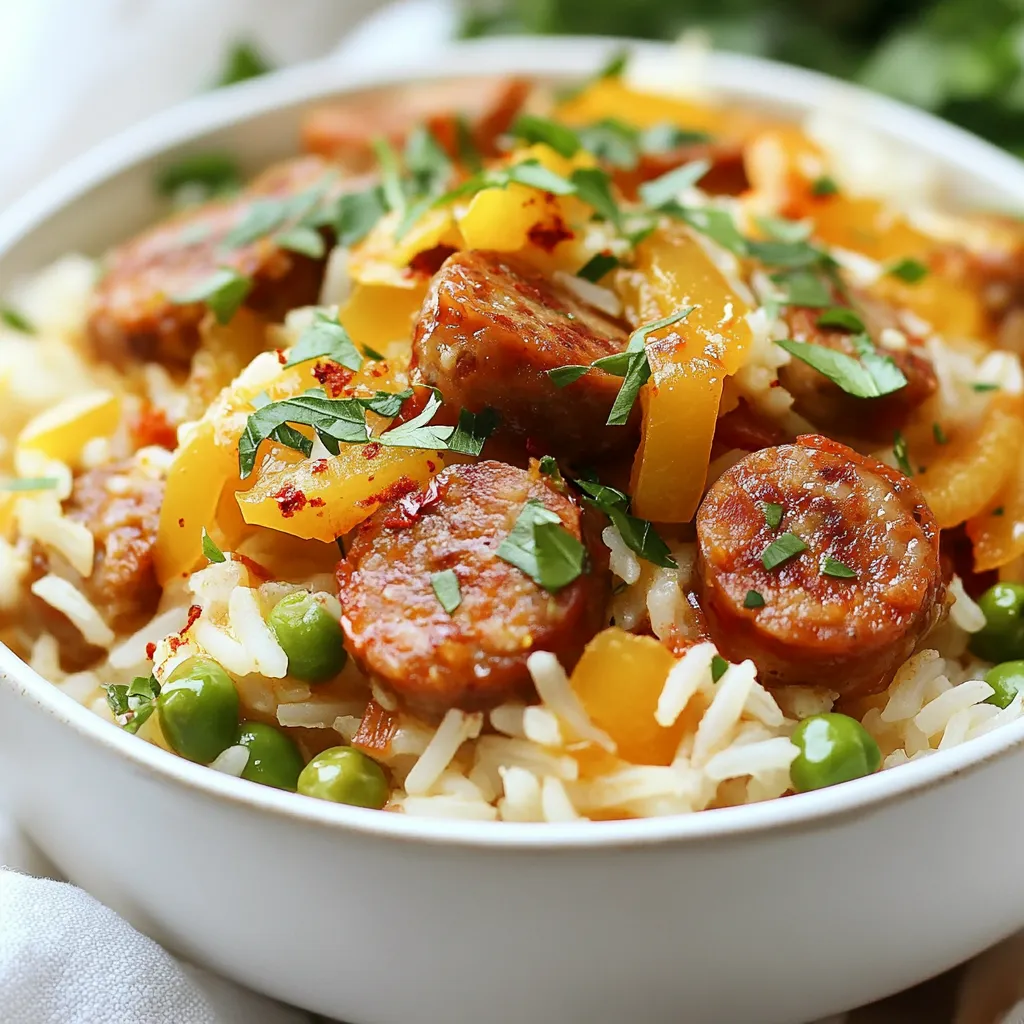 To make One Pot Sausage and Rice, you need a handful of tasty ingredients. Here’s the list to get you started: - 1 lb (450g) spicy Italian sausage, sliced - 1 cup long-grain white rice - 1 medium onion, chopped - 1 bell pepper (any color), diced - 1 can (14.5 oz) diced tomatoes, drained - 2 cups chicken broth - 1 teaspoon smoked paprika - 1 teaspoon dried oregano - ½ teaspoon red pepper flakes (adjust to taste) - 1 cup frozen peas - 2 tablespoons olive oil - Salt and pepper to taste - Fresh parsley, chopped (for garnish) These ingredients make for a hearty and satisfying meal. Each one brings its own flavor to the dish. The spicy Italian sausage adds a nice kick. The rice absorbs all the rich flavors, making each bite delicious. The vegetables provide color and crunch. Plus, the seasonings enhance the taste, making it a dish you will love. Don't forget the peas for a pop of sweetness and the parsley for a fresh finish! {{ingredient_image_1}} - Heat 2 tablespoons of olive oil in a large pot over medium heat. - Add 1 pound of sliced spicy Italian sausage. Cook for 5-7 minutes until browned on all sides. Remove the sausage and set it aside. - In the same pot, add 1 chopped onion and 1 diced bell pepper. Sauté for 3-4 minutes. The veggies should start to soften. - Stir in 2 minced garlic cloves, 1 teaspoon smoked paprika, 1 teaspoon dried oregano, and ½ teaspoon red pepper flakes. Cook for 1 minute until fragrant. - Add 1 cup of long-grain white rice to the pot. Stir well to coat the rice with the veggies and spices. - Pour in 2 cups of chicken broth and add 1 can of drained diced tomatoes. Stir until combined. - Bring the mixture to a boil. Then, lower the heat and cover the pot. Let it simmer for 15-20 minutes. The rice will absorb most of the liquid and be tender. - After 15 minutes, add back the cooked sausage and 1 cup of frozen peas. Cover the pot again and let it sit for 5 more minutes. Season with salt and pepper to taste before serving. Enjoy your meal! To make this dish pop, adjust the spices to your taste. Start with the red pepper flakes. If you like heat, add more. If you prefer mild, cut back. You can also try other spices like cayenne for a different kick. Here are some cooking tips to enhance flavor: - Use high-quality sausage for the best taste. - Sear the sausage until it's golden brown. This adds depth. - Don't skip the garlic; it brings a lot of flavor. - Stir in the peas at the end for a fresh bite. Presentation matters! Serve the dish in deep bowls. This keeps the rice and sausage warm. Garnish with fresh parsley for a pop of color. A sprinkle of red pepper flakes also adds a nice touch. For serving, use a large platter for family-style meals. It makes sharing easy and fun. You can also add lemon wedges on the side. They brighten the flavors and add a zesty twist. Pro Tips Use Fresh Ingredients: Always opt for fresh vegetables and herbs to enhance the flavor of your dish. Fresh ingredients make a significant difference in taste. Adjust Spice Levels: If you're sensitive to heat, start with less red pepper flakes and gradually add more to reach your preferred spice level. Rest Before Serving: Letting the dish rest for a few minutes after cooking allows the flavors to meld together, resulting in a more delicious meal. Experiment with Proteins: Feel free to substitute the spicy Italian sausage with other proteins like chicken or turkey for a different flavor profile. {{image_2}} You can swap the spicy Italian sausage for other meats. Turkey sausage works well too. Chicken sausage is a leaner option. If you prefer beef, it can add a nice flavor. Just remember to adjust cooking times for different proteins. If you want a meatless dish, try using plant-based sausage. There are many good brands available that mimic the taste. You can also use beans, like black beans or chickpeas. They add protein and texture without meat. Adding spices can change the dish's flavor. Try adding cumin for a warm, earthy taste. A dash of cayenne pepper can give a nice kick. You might enjoy adding fresh herbs like thyme or basil. They brighten the meal and add freshness. You can also switch out the vegetables. Zucchini or mushrooms can replace the bell pepper. Spinach is a great green option too. Just add it towards the end so it stays bright and fresh. Mixing in corn adds a sweet note. Play with flavors to find what you love! - Refrigeration tips: Store any leftover One Pot Sausage and Rice in an airtight container. Keep it in the fridge for up to four days. This keeps the dish fresh and safe to eat. - Freezing guidelines: To freeze, place the cooled dish in a freezer-safe container. It can last for up to three months. When you're ready to eat, thaw it overnight in the fridge before reheating. - Methods for optimal texture: To reheat, use the stovetop or microwave. If using the stovetop, add a splash of broth or water. Stir occasionally to heat evenly. If using the microwave, cover the dish to keep moisture in. - Time and temperature recommendations: Heat on medium for about 5-10 minutes on the stove. In the microwave, heat for 2-3 minutes on high. Always check that it's hot throughout before serving. You can serve One Pot Sausage and Rice with many sides. A fresh green salad pairs well. You can also add crusty bread to soak up the flavors. For a heartier meal, try some roasted vegetables. If you like spice, serve with pickled jalapeños. Yes, you can make One Pot Sausage and Rice ahead of time. Cook it fully and let it cool. Then, store in an airtight container in the fridge. It stays fresh for 3-4 days. You can also freeze it for up to 3 months. Just reheat on the stove or in the microwave. To check if the rice is done, take a look at the texture. The rice should be soft and fluffy. If it is still hard or crunchy, it needs more time. You can also taste a small spoonful. If it is tender, then it is ready. This blog post walks you through making a delicious one-pot sausage and rice dish. We co