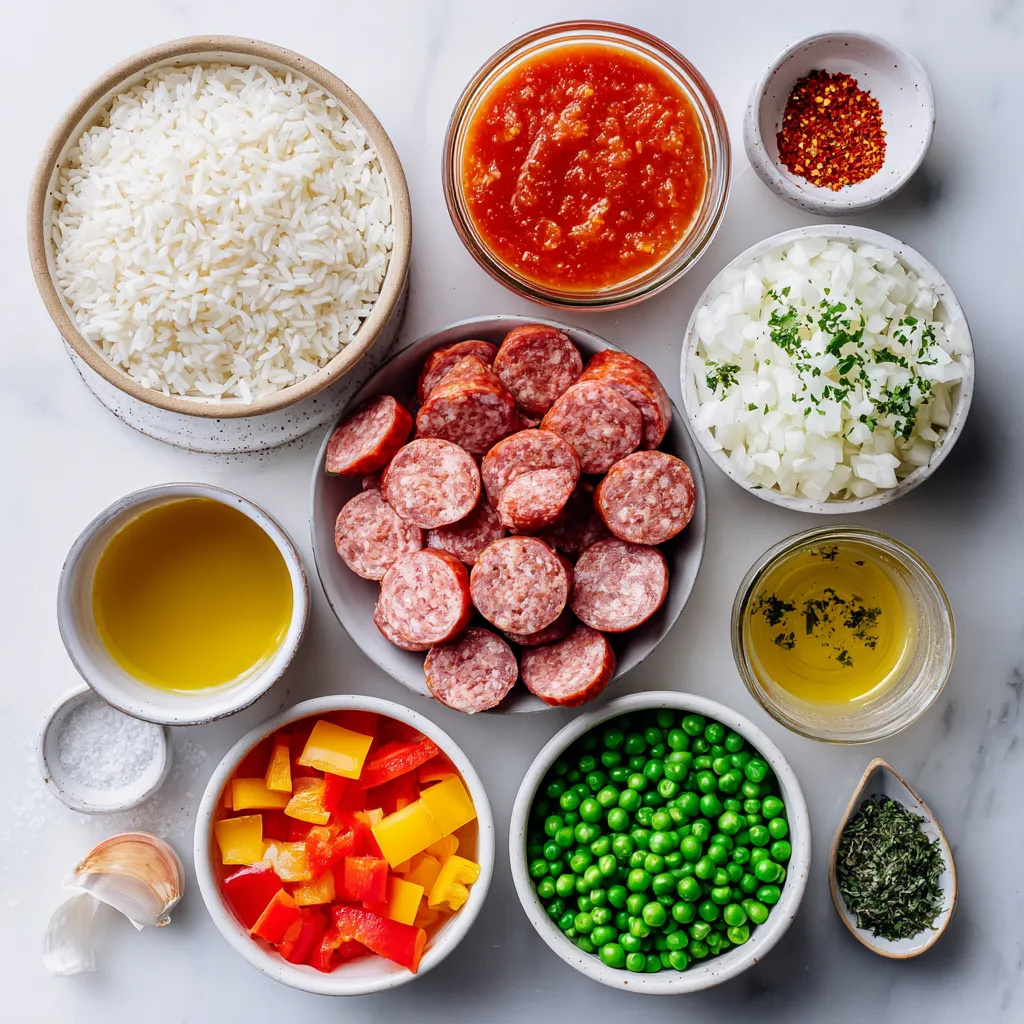 To make One Pot Sausage and Rice, you need a handful of tasty ingredients. Here’s the list to get you started: