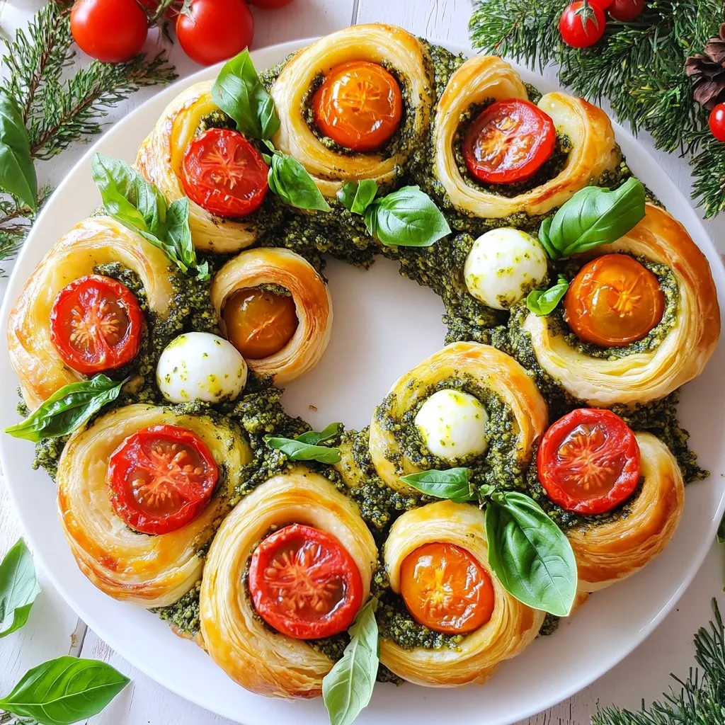 A festive wreath made with puff pastry, pesto, and mozzarella, perfect for holiday gatherings.