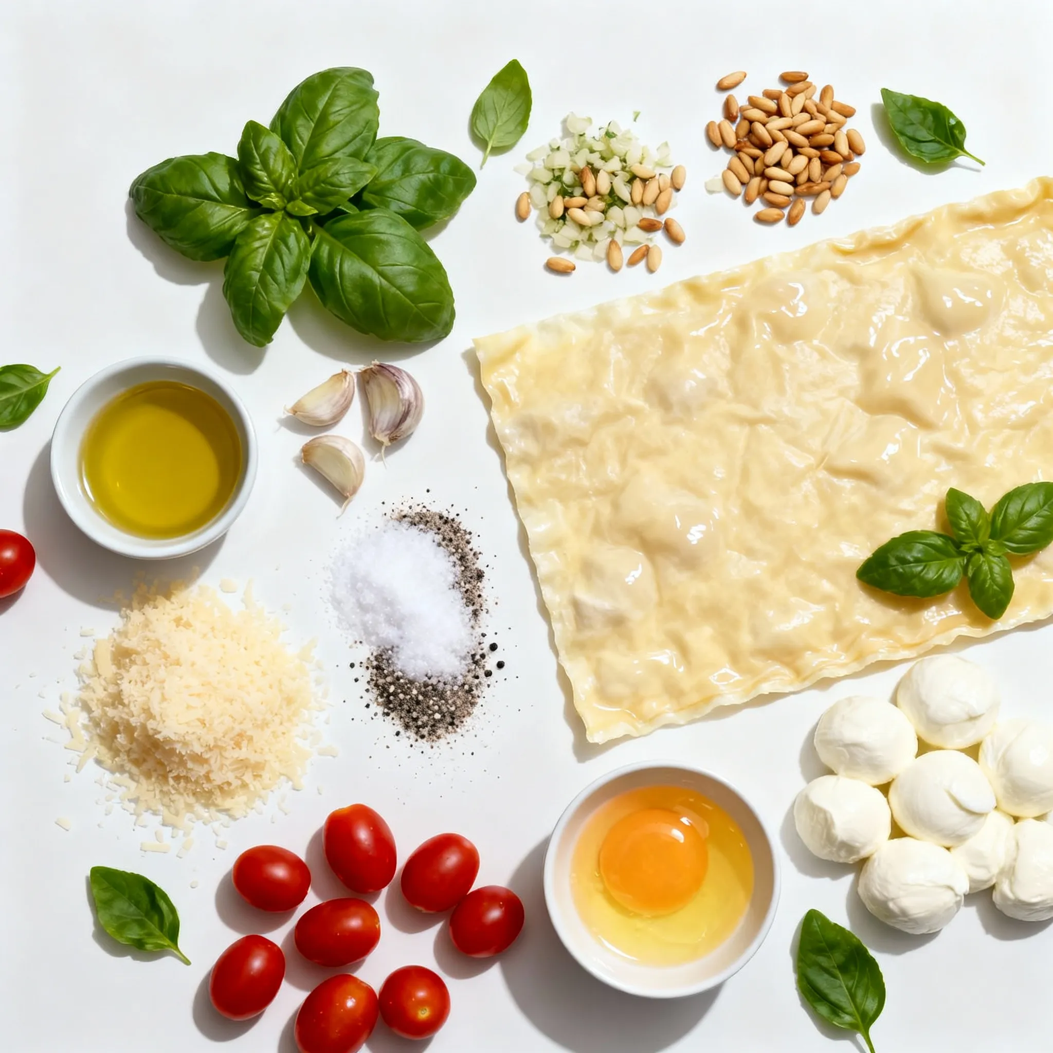 Make the Pesto: In a food processor, combine the fresh basil, olive oil, minced garlic, toasted pine nuts, and grated Parmesan cheese. Blend until smooth. Season with salt and pepper to taste. Set aside.