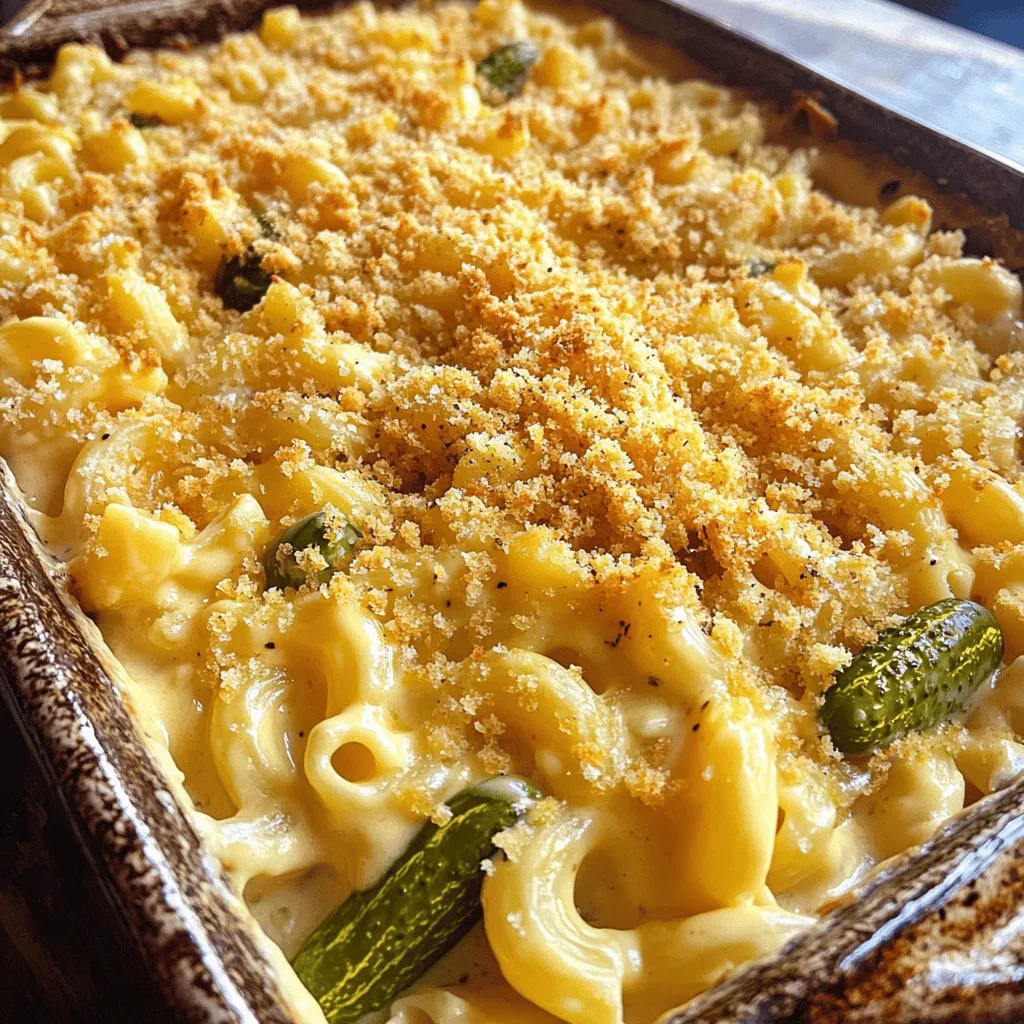 To create the perfect Pickle Mac and Cheese, gather these items: - 8 oz elbow macaroni - 2 cups shredded sharp cheddar cheese - 1 cup dill pickles, finely chopped - 1/2 cup pickle juice - 2 tbsp unsalted butter - 2 tbsp all-purpose flour - 2 cups milk - 1 tsp garlic powder - 1 tsp onion powder - Salt and pepper, to taste - 1/2 cup breadcrumbs (optional, for topping) These ingredients come together for a flavor explosion. The sharp cheddar cheese gives a rich taste, while dill pickles add a tangy crunch. The pickle juice enhances the dish, making it unique and fun. Using elbow macaroni makes it easy to mix and serve. Each bite offers comfort and excitement. For a crispy top, consider the breadcrumbs. They add a lovely texture contrast. Enjoy the process of gathering these ingredients! You can find the full recipe outlined in detail to guide you through cooking this delightful dish. - Boil salted water and cook macaroni according to package instructions. This step is key for a good base. Make sure you cook until it is al dente. This means it should still have a bit of bite to it. Drain the macaroni and set it aside. - Create a roux with butter and flour. In the same pot, melt two tablespoons of unsalted butter over medium heat. Once the butter melts, add two tablespoons of flour. Whisk it for about one minute. This roux helps thicken your sauce. - Gradually whisk in milk until thickened. Now, slowly add two cups of milk while whisking. Keep stirring to avoid lumps. Cook this mixture for about two to three minutes until it thickens just a bit. - Stir in cheddar cheese until melted. Lower the heat and add two cups of shredded sharp cheddar cheese. Stir until it melts into a smooth sauce. - Add pickle juice and chopped pickles. Next, pour in half a cup of pickle juice and one cup of finely chopped dill pickles. Also, add one teaspoon of garlic powder, one teaspoon of onion powder, salt, and pepper. Stir everything well to combine. - Fold in cooked macaroni. Take the cooked macaroni and gently fold it into the cheese sauce. Make sure every piece is coated. - Optional baking steps for breadcrumb topping. If you want a crunchy topping, transfer the mixture to a baking dish. Sprinkle half a cup of breadcrumbs on top. Bake in a preheated oven at 350°F for 15 to 20 minutes until golden and bubbly. For the full recipe, check the cooking steps above. Enjoy your flavorful Pickle Mac and Cheese! To make the best cheese sauce, start by using the right cheese. I recommend sharp cheddar. It melts nicely and adds great flavor. Use fresh milk for a smooth sauce. When making the roux, whisk the butter and flour well. Cook it for about one minute to remove the raw taste. Next, when you add the milk, do it slowly. This method helps to avoid lumps. Keep whisking as the sauce thickens. If it seems too thick, add a bit more milk. You want a creamy texture that coats the pasta well. For flavor, feel free to adjust the spices. Garlic powder and onion powder add depth. If you like a kick, add some cayenne or smoked paprika. Taste the sauce before mixing in the pasta. This way, you can tweak the flavors to your liking. A common mistake is overcooking the pasta. You want it al dente, so it holds up in the dish. Remember, it will cook a bit more when you bake it, if you choose to. Another mistake is skipping the roux. This step is key for a thick sauce. Without it, your cheese sauce may be runny. Always take the time to make a proper roux for the best results. These tips will help you create a delicious Pickle Mac and Cheese. For the full recipe, check out [Full Recipe]. {{image_2}} You can switch up the cheese in your Pickle Mac and Cheese for extra taste. Try mozzarella for a gooey texture or pepper jack for a spicy kick. Cream cheese adds a smooth richness. Mixing different cheeses can create a fun flavor burst. Protein can take this dish to new heights. Adding crispy bacon gives a smoky flavor. Cooked chicken adds heartiness. You could even try diced ham for a savory twist. Each option brings its unique taste to the table. If you need gluten-free options, choose gluten-free pasta. Many brands now offer great shapes that mimic regular pasta. Look for options made from rice or quinoa. These will cook up just like traditional pasta. For the sauce, you can use cornstarch or arrowroot powder instead of flour. Mix it with cold milk before adding to your pot. This helps thicken the sauce without gluten. Your Pickle Mac and Cheese will still be creamy and rich. Check out the [Full Recipe] to explore all the tasty details! To keep your Pickle Mac and Cheese fresh, store it in an airtight container. Make sure to cool it to room temperature first. Then, place it in the fridge for up to three days. If you need to store it longer, consider freezing. For freezing, divide it into portions. Use freezer-safe bags or containers, but leave some space for expansion. This way, you can enjoy your tasty dish even after a few weeks. When you're ready to eat again, reheating is key. For best results, use the oven. Preheat it to 350°F (175°C). Place the mac and cheese in a baking dish and cover it with foil. Heat for about 20 minutes or until warm. You can also microwave it. Place a portion in a microwave-safe bowl and cover it loosely with a lid. Heat for one minute, stir, then heat for another minute. Add a splash of milk if it seems dry. Enjoy your comforting dish just as you made it! Pickles add a few health perks to your dish. They are low in calories, so they won’t add much to your meal. Pickles also provide probiotics, which are good for your gut health. They can help with digestion too. Plus, dill pickles have vitamin K, which is great for your bones. Just remember to enjoy them in moderation, as they can be high in sodium. Yes, you can easily make this dish vegetarian. First, ensure your cheese is vegetarian-friendly, as some cheeses use animal rennet. You can also substitute the butter with a plant-based spread. For a creamie