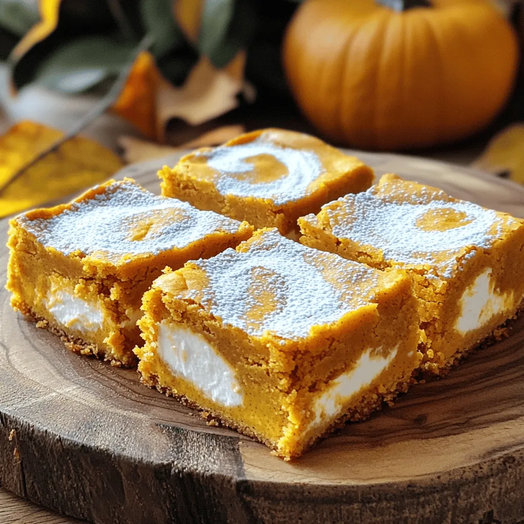 To make delicious pumpkin cream cheese blondies, gather these key ingredients: - 1 cup pumpkin puree - 1 cup brown sugar - 1/2 cup granulated sugar - 1/2 cup unsalted butter, melted - 2 large eggs - 1 teaspoon vanilla extract - 1 teaspoon baking powder - 1/2 teaspoon baking soda - 1 teaspoon ground cinnamon - 1/2 teaspoon ground nutmeg - 1/4 teaspoon salt - 1 1/2 cups all-purpose flour - 8 oz cream cheese, softened - 1/4 cup powdered sugar - 1 tablespoon lemon juice These ingredients blend to create a moist, flavorful treat that's perfect for fall. If you don’t have some ingredients, don’t worry. Here are some easy swaps: - Use maple syrup for brown sugar. - Swap unsalted butter with coconut oil. - Replace eggs with flaxseed meal mixed with water. - Choose gluten-free flour for a gluten-free option. - For cream cheese, use dairy-free cream cheese. These substitutes maintain the blondie’s flavor and texture. Fresh ingredients make a big difference in taste. Here are my tips: - Pumpkin Puree: Choose canned pumpkin, not pumpkin pie filling. - Spices: Check expiration dates on ground spices. Fresh spices enhance flavor. - Cream Cheese: Look for a smooth and soft texture. - Eggs: Use farm-fresh eggs for the best flavor. - Butter: Use unsalted butter for better control over salt levels. Using fresh ingredients ensures your blondies taste amazing and delightful. Start by preheating your oven to 350°F (175°C). This step is key for even baking. Grab a 9x9 inch baking pan and grease it well. For easy removal, line it with parchment paper. This will help us lift the blondies out later. In a large mixing bowl, combine 1 cup of pumpkin puree, 1 cup of brown sugar, and 1/2 cup of granulated sugar. Pour in 1/2 cup of melted unsalted butter. Mix these ingredients well until the sugars dissolve. This creates a sweet and creamy base for your blondies. Next, crack in 2 large eggs and add 1 teaspoon of vanilla extract. Whisk this mixture until it’s smooth and creamy. Make sure there are no lumps. Now, let’s prepare the dry mix. In another bowl, sift together 1 teaspoon of baking powder, 1/2 teaspoon of baking soda, 1 teaspoon of ground cinnamon, 1/2 teaspoon of ground nutmeg, 1/4 teaspoon of salt, and 1 1/2 cups of all-purpose flour. Sifting helps to remove lumps and ensures even mixing. Gradually fold the dry ingredients into the wet mixture using a spatula. Mix gently until just combined. Be careful not to overmix. This step helps keep your blondies soft and chewy. Now, we are ready to add the cream cheese. In a small bowl, beat together 8 oz of softened cream cheese, 1/4 cup of powdered sugar, and 1 tablespoon of lemon juice until smooth. This cream cheese mixture adds a lovely tang to the blondies. Pour half of your blondie batter into the prepared pan, spreading it evenly. Next, dollop spoonfuls of the cream cheese mixture over the batter. Use a knife to swirl it slightly. Then, pour the remaining batter over the cream cheese layer and spread it out evenly. Bake your blondies in the preheated oven for 25-30 minutes. Check for doneness by inserting a toothpick into the center. It should come out with a few moist crumbs. Let the blondies cool in the pan for about 10 minutes. Then, lift them out using the parchment paper. Cool them completely on a wire rack. This cooling step helps set the flavors and texture perfectly. To make great blondies, mix just enough. After adding flour, fold it in gently. This keeps your blondies light and fluffy. Overmixing adds too much air and can make them tough. You want a nice, thick batter. If you see a few flour streaks, that's okay! It's better to under-mix than to overdo it. Creating a lovely cream cheese swirl is easy. Start by dolloping the cream cheese mixture onto the batter. Use a knife to swirl it gently. Don’t mix too much; you want to see both the blondie and cream cheese. This adds pretty patterns and layers of flavor. The key is to be gentle and not to stir it all together. Add more flavor to your blondies with spices and mix-ins. Here are some ideas: - Spices: Try adding ginger or cloves for a warm taste. - Mix-ins: Chopped nuts, chocolate chips, or even dried fruit can make them special. - Citrus: A bit of orange zest brightens the flavor. These small changes can make your blondies stand out. Have fun experimenting with your favorite flavors! {{image_2}} You can add fun twists to your pumpkin cream cheese blondies. Nuts or chocolate chips give extra flavor and texture. Try adding chopped walnuts or pecans for a crunchy bite. If you love chocolate, mix in some semi-sweet chocolate chips. Use about 1 cup of either nuts or chocolate chips. Just fold them into the batter before you pour it into the pan. If you need a gluten-free option, you can swap the all-purpose flour. Use a gluten-free flour blend instead. Look for blends that include xanthan gum for best results. Also, ensure your baking powder is gluten-free. This way, you can enjoy these treats without worry. They will still taste great, just like the original recipe! To make vegan pumpkin cream cheese blondies, you can replace the eggs and cream cheese. Use flax eggs instead of regular eggs. Mix 1 tablespoon ground flaxseed with 2.5 tablespoons of water. Let it sit for a few minutes to thicken. For the cream cheese, try a vegan cream cheese alternative. It keeps the blondies creamy and delicious. You can still enjoy the same fall flavors in a vegan way! To keep your pumpkin cream cheese blondies fresh, place them in an airtight container. Lay a piece of parchment paper between layers to prevent sticking. Store at room temperature for up to three days. If you want to keep them longer, refrigerate them for up to a week. The cool air will help maintain their soft texture. You can freeze these blondies for later enjoyment. Cut them into squares and wrap each piece in plastic wrap. Place the wrapped blondies in a freezer-safe bag or container. They will last up to three months in the freezer. W
