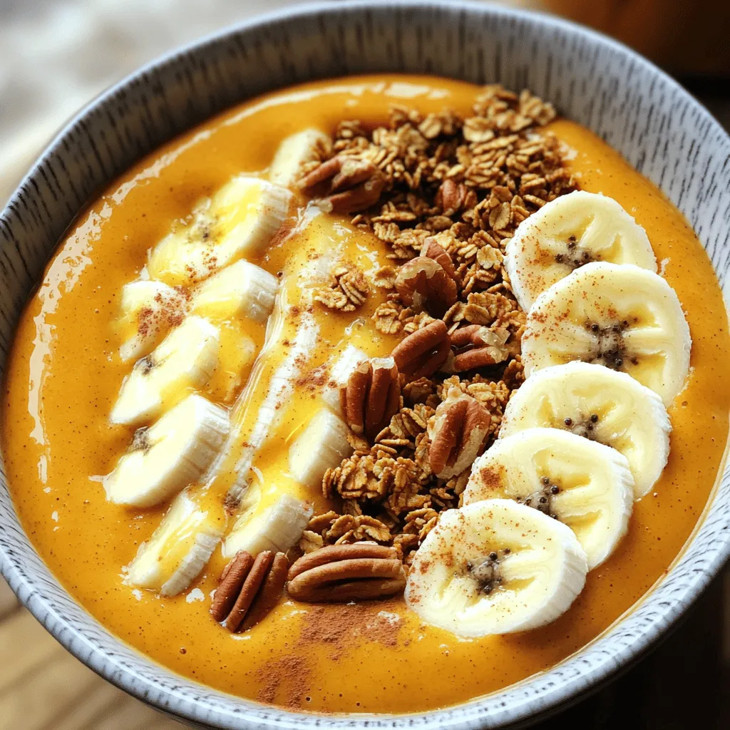 Toppings take your smoothie bowl to the next level. Granola adds a satisfying crunch. Sliced bananas boost the banana flavor and add freshness. Chopped pecans give a nice nutty taste. A sprinkle of cinnamon enhances the cozy fall vibe. Lastly, a drizzle of honey adds a sweet finish. Feel free to mix and match toppings based on your taste!