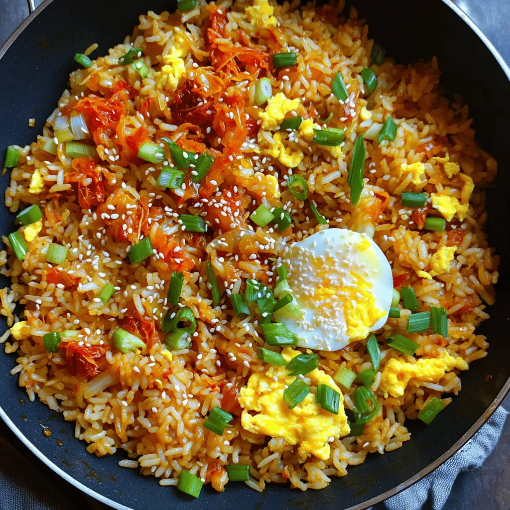 - 2 cups cooked jasmine rice (preferably day-old) - 1 cup kimchi, chopped (and the juice reserved) - 1 tablespoon vegetable oil - 1 tablespoon soy sauce - 1 teaspoon sesame oil - 1 teaspoon gochugaru (Korean chili flakes) - optional for extra heat - 2 green onions, chopped - 2 cloves garlic, minced - 1 large egg The main ingredients for Quick Kimchi Fried Rice make it a fast and tasty dish. The jasmine rice gives a nice texture. Use day-old rice for the best results. Kimchi adds bold flavors and a kick. The vegetable oil helps to fry the rice and kimchi well. For seasonings, soy sauce brings saltiness and depth. Sesame oil adds a nutty taste that warms the dish. Gochugaru gives a spicy touch. Adjust the amount based on your taste. Don’t forget the garlic and green onions! They add fresh notes and brightness. The egg binds everything together and gives creaminess. It’s the perfect topping that makes the dish rich and satisfying. - Gather all ingredients. You will need: - 2 cups cooked jasmine rice - 1 cup chopped kimchi - 1 tablespoon vegetable oil - 2 green onions, chopped - 2 cloves garlic, minced - 1 large egg - 1 tablespoon soy sauce - 1 teaspoon sesame oil - 1 teaspoon gochugaru (optional) - Sesame seeds for garnish - Prepare the skillet. Use a large skillet or wok for even cooking. - Heat the oil in the skillet over medium-high heat. - Add the minced garlic. Sauté it for about 30 seconds. The garlic should smell great. - Add the chopped kimchi to the skillet. Sauté it for 3-4 minutes. Let it caramelize for extra flavor. - Push the kimchi to one side of the skillet. Crack the egg into the empty space. - Scramble the egg until fully cooked. Mix it with the kimchi. - Add the cooked jasmine rice to the skillet. Break apart any clumps. - Pour in the reserved kimchi juice, soy sauce, sesame oil, and gochugaru, if using. Mix well to coat the rice. - Stir-fry the mixture for another 3-5 minutes. Heat it through while adjusting seasoning if needed. - Remove from heat. Garnish with chopped green onions and sesame seeds before serving. Using day-old rice is key for great fried rice. Fresh rice can be too sticky. Day-old rice has drier grains, which help it fry nicely. If you don’t have jasmine rice, you can use other types. Long-grain rice or basmati works well too. These options keep the dish light and fluffy. You can make this dish your own by changing the spice. Gochugaru adds heat, but start slow. A little goes a long way. If you want more flavor, add more kimchi or its juice. You can also swap in different vegetables. Peas, carrots, or bell peppers are great choices. Proteins like chicken or shrimp can boost your meal too. If you want a vegan version, replace the egg. Tofu or chickpeas are good substitutes. They add protein and texture. You can also use nutritional yeast for a cheesy taste. This way, you keep it tasty and healthy! {{image_2}} You can boost your quick kimchi fried rice with proteins. Try adding chicken, shrimp, or tofu. Each option brings a different flavor and texture. For chicken, sauté bite-sized pieces until golden. If you use shrimp, cook them until they turn pink. For tofu, press it to remove water, then cube and fry until crispy. These proteins blend well with the rice and kimchi, making each bite delightful. To make your dish heartier, add more vegetables. Consider using peas, carrots, or bell peppers. You can also toss in greens like spinach or bok choy for added nutrition. If you want to skip the egg, try using scrambled tofu or chickpea flour. These substitutes keep the meal filling without losing flavor. You can create fun twists by mixing in other cuisines. For a Mexican flair, add black beans and corn, then top with avocado. To give it an Italian vibe, stir in sun-dried tomatoes and basil. These unique ideas let you explore flavors while enjoying your kimchi fried rice. Let your taste buds guide your choices! To keep your kimchi fried rice fresh, place it in the fridge. Use an airtight container. This helps prevent the rice from drying out or absorbing other smells. Make sure to cool the rice before storing it. This keeps it safe and tasty. You can reheat your fried rice in two ways: microwave or stovetop. For the microwave, place the rice in a bowl. Add a splash of water to keep it moist. Heat for about one minute, stir, then heat for another minute. For stovetop, use a skillet. Add a little oil and heat the rice over medium heat. Stir until hot. This method keeps the texture nice and fluffy. To freeze your kimchi fried rice, let it cool first. Then, scoop it into a freezer-safe bag or container. Squeeze out as much air as possible. This keeps the rice from getting freezer burn. You can store it for up to three months. When ready to eat, thaw it in the fridge overnight before reheating. Kimchi fried rice stays good in the fridge for about 3 to 4 days. To keep it fresh, store it in an airtight container. This helps protect the flavors and keeps it safe to eat. When you want to enjoy it again, simply reheat it until hot. You can use fresh rice, but day-old rice works better. Fresh rice has more moisture, which can make the dish mushy. Day-old rice dries out a bit, making it easier to fry. If you must use fresh rice, let it cool before cooking to reduce moisture. Kimchi is more than just tasty; it has many health benefits. It is rich in probiotics, which are good for your gut health. Kimchi also contains vitamins A, B, and C. It has antioxidants and may help with digestion. Plus, it's low in calories, making it a great choice for many diets. Kimchi fried rice is a tasty dish made with simple ingredients. You add cooked jasmine rice, chopped kimchi, and seasonings like soy sauce and sesame oil. Preparing and cooking it takes just a few steps. You can customize it with proteins or keep it vegan. Remember to store leftovers properly. This dish is not only quick to make but also bursting with flavor and nutrition. I hope you try it and enjoy your cooking a