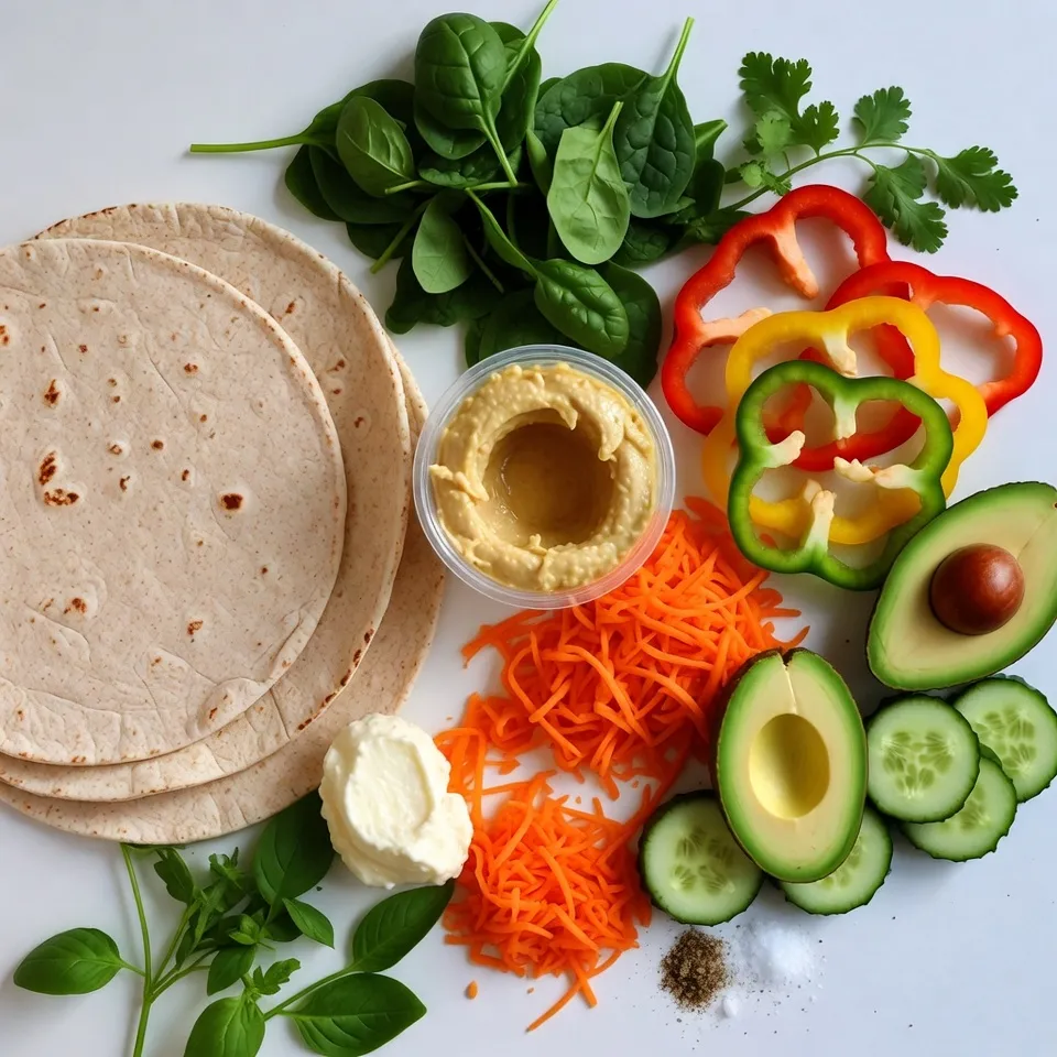 To create Rainbow Veggie Pinwheel Wraps, you need some simple ingredients. You start with whole wheat tortillas. These wraps give a nice, soft base. Next, choose your favorite hummus. You can use creamy or chunky varieties. If you want extra richness, add cream cheese.