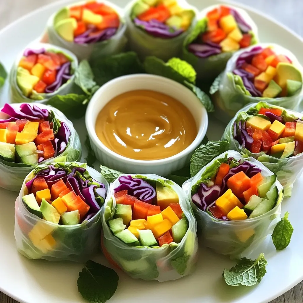 - 8 rice paper wrappers - 1 cup red cabbage, thinly sliced - 1 cup carrots, julienned - 1 bell pepper (any color), thinly sliced - 1 cucumber, julienned - 1 avocado, sliced - 1 cup fresh mint leaves - 1 cup fresh basil leaves - 1/4 cup cilantro leaves - 1 cup vermicelli noodles, cooked - 1/4 cup peanut butter - 2 tablespoons soy sauce - 1 tablespoon sesame oil - 1 tablespoon lime juice - 1 tablespoon honey (or agave syrup for vegan) - Salt and pepper to taste I love using rice paper wrappers for these spring rolls. They are light and easy to work with. You will need about eight wrappers. Make sure to have fresh vegetables on hand. I usually pick red cabbage, carrots, bell pepper, cucumber, and avocado. They add bright colors and crunch. Fresh herbs bring a lot of flavor. I like to use mint, basil, and cilantro. They make each bite fresh and tasty. You also need cooked vermicelli noodles. They add a soft texture to the rolls. For the peanut dip, gather peanut butter, soy sauce, sesame oil, lime juice, and honey or agave syrup. Don’t forget salt and pepper. This sauce ties everything together. It’s creamy, tangy, and sweet. It complements the veggies perfectly. Be sure to prep your ingredients before you start. This helps you roll the spring rolls easily. You will enjoy the vibrant colors and flavors of this dish! {{ingredient_image_1}} Start by cooking the vermicelli noodles. Follow the package instructions. Usually, this means boiling water and cooking for about 3 to 5 minutes. Once they are soft, drain them in a colander. Rinse the noodles under cold water to stop the cooking process. This keeps them from getting sticky. Set the noodles aside to cool completely. To make the dipping sauce, grab a small bowl. Mix together the peanut butter, soy sauce, sesame oil, lime juice, and honey. Use a whisk or fork to blend them well. If the sauce is too thick, add a splash of water. Keep mixing until you reach your desired consistency. It should be smooth and easy to dip. Now, it's time to prepare the veggies and herbs. Slice the red cabbage, carrots, bell pepper, and cucumber into thin, long strips. Use a sharp knife for clean cuts. For the herbs, make sure to remove any thick stems. Keep the mint, basil, and cilantro leaves whole or roughly chopped. This will add fresh flavors to your rolls. For wrapping, fill a shallow dish with warm water. Dip one rice paper wrapper into the water for about 10 to 15 seconds. You want it to be soft but not too mushy. Lay the wrapper on a clean surface. In the center, place a small amount of vermicelli noodles. Then, add a few slices of each vegetable and some herbs. To roll the spring roll, fold the sides of the rice paper over the filling. Starting from the bottom, roll it up tightly. Make sure all the filling is secure inside. Repeat this process with the remaining wrappers and ingredients. Enjoy the fun of rolling! To make perfect spring rolls, avoid common mistakes. First, do not overfill your wrappers. This can make rolling hard. Use just enough filling to keep the rolls tight but not bursting. Next, ensure your rice paper is flexible. Soak each wrapper for 10-15 seconds in warm water. If it's too stiff, it will crack when you roll. You can adjust the flavor of your dipping sauce easily. Try adding a splash of sriracha for heat or a dash of ginger for zest. Recommended sauces include hoisin or sweet chili sauce. These pair well with the fresh veggies in the rolls. For a beautiful presentation, serve the spring rolls in a colorful dish. Place a small bowl of dipping sauce in the center. Garnish with leftover mint or basil on top for a fresh look. You can also slice the rolls in half for a fun display. Pro Tips Freshness is Key: Use the freshest vegetables and herbs possible for vibrant flavor and crunch. Rice Paper Handling: Don’t soak the rice paper too long; it should be soft but not overly mushy to maintain structure. Customize the Fillings: Feel free to add your favorite proteins like shrimp or tofu for extra heartiness. Chill Before Serving: Refrigerate the assembled spring rolls for 15-20 minutes before serving for a refreshing bite. {{image_2}} You can easily add protein to your rainbow veggie spring rolls. Here are some great options: - Shrimp: Cooked shrimp adds a nice seafood flavor. Use peeled and deveined shrimp. Simply boil or sauté them before adding. - Chicken: Grilled or rotisserie chicken works well. Slice it thinly for easy rolling. - Tofu: For a plant-based option, use firm tofu. Press it to remove moisture, then cube it and pan-fry until golden. These proteins boost flavor and make the rolls more filling. For those with dietary needs, you can swap out ingredients easily: - Alternative sauces: Use almond butter or tahini instead of peanut butter for a nut-free option. You can also try coconut aminos instead of soy sauce for a gluten-free choice. - Vegetable substitutions: Feel free to swap vegetables based on your taste. Try bell peppers, zucchini, or radishes to mix things up. These alternatives ensure everyone can enjoy the rolls. If you need gluten-free options, don’t worry! - Use gluten-free rice paper. Most brands are naturally gluten-free. Just check the labels. - Opt for gluten-free vermicelli noodles. These are easy to find, and they work just like regular noodles. These simple changes make the dish safe for those with gluten sensitivities. To keep your spring rolls fresh, store them in an airtight container. Place a damp paper towel between layers to prevent drying out. This method helps keep the rice paper soft and the veggies crisp. You can store them in the fridge for up to two days. You can prepare all the ingredients in advance. Slice your veggies and herbs a day before and keep them in the fridge. This saves time when you want to make spring rolls. Just remember to soak the rice paper right before rolling. It’s best to roll them close to serving time for the best texture. To freeze spring rolls, wrap each one in 