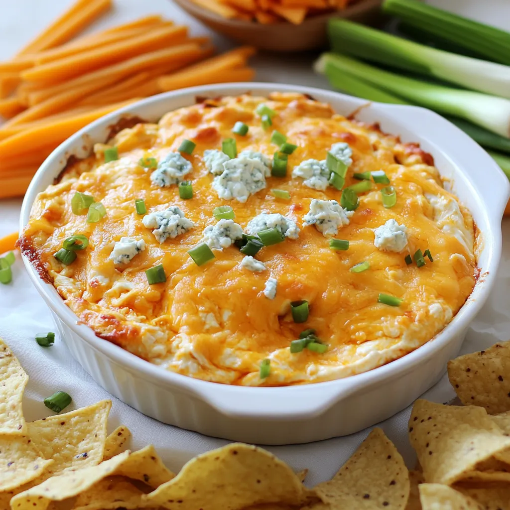 For a fun display, arrange tortilla chips or veggie sticks around the dip. This makes it look inviting. You can also use small bowls for extra sauces. Place buffalo sauce and blue cheese dressing on the side. This way, guests can choose their favorites. A sprinkle of chopped green onions on top adds color and freshness.