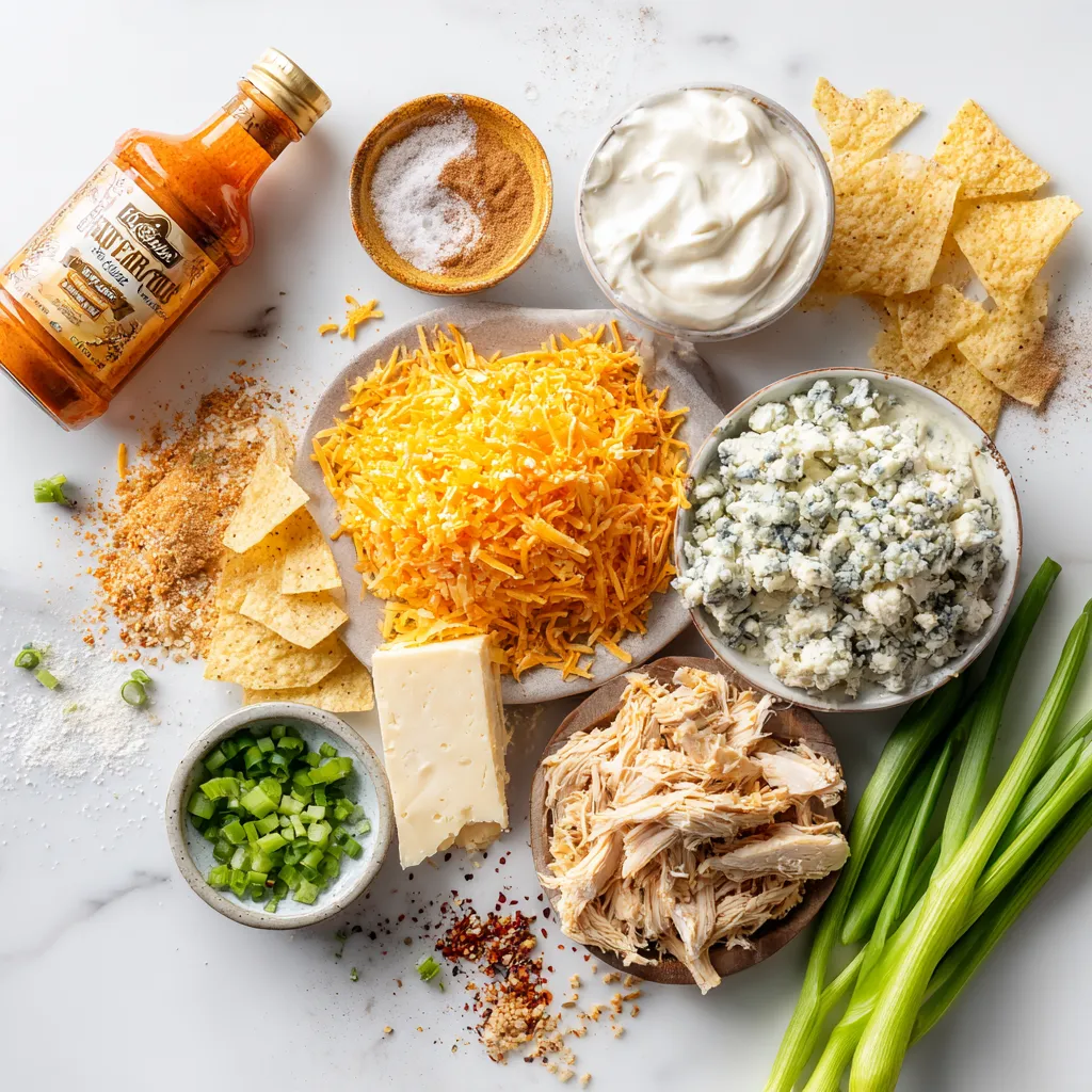 These three main ingredients form the heart of your Buffalo chicken dip. The rotisserie chicken gives it a rich flavor and saves you time. Cream cheese adds a creamy texture, making each bite smooth. Greek yogurt lightens the dip while adding a slight tanginess.