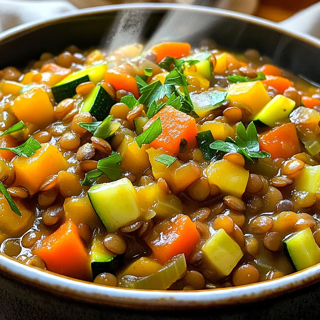 - 1 cup lentils (green or brown) - 3 medium carrots - 2 ribs celery - 1 large onion - 2 cloves garlic - 1 medium zucchini - 1 bell pepper - 1 cup diced tomatoes - 4 cups vegetable broth - 1 teaspoon dried thyme - 1 teaspoon ground cumin - 1 teaspoon smoked paprika - Salt and pepper to taste - 2 tablespoons olive oil I love using lentils for this stew. They give a great texture and flavor. You can choose green or brown lentils. They both work well. Carrots add sweetness and color. Celery brings a nice crunch and fresh taste. I chop the onion and mince the garlic for a strong base flavor. Zucchini and bell pepper add even more taste and texture. Diced tomatoes make the stew juicy. Vegetable broth is key for depth. The spices, like thyme and cumin, create warmth. Smoked paprika adds a smoky twist. Don't forget the salt and pepper to make every bite pop. - Balsamic vinegar - Fresh parsley for garnish For a little zing, I love adding balsamic vinegar. It gives the stew a nice tang. Fresh parsley on top makes the dish look pretty and adds freshness. Each ingredient plays a role. They work together to create a tasty and hearty stew. Enjoy these fresh flavors in every spoonful! * How do I sauté onion and garlic? Start by heating 2 tablespoons of olive oil in a skillet. Add the chopped onion and minced garlic. Cook them over medium heat for about 5 minutes. The onion should become soft and clear. This step builds a lovely base for your stew. * What do I do after sautéing? Once the onion and garlic are ready, transfer the mix to your slow cooker. This sets the stage for the rest of your dish. * How do I add vegetables and lentils? In the slow cooker, add the diced carrots, celery, zucchini, bell pepper, and 1 cup of rinsed lentils. Layer them well to ensure even cooking. * What about the broth and seasoning? Pour in 1 cup of diced tomatoes and 4 cups of vegetable broth. Then, sprinkle in 1 teaspoon each of dried thyme, ground cumin, and smoked paprika. Add salt and pepper to taste. Stir everything together to mix the flavors. * How do I choose between low and high settings? You can cook your stew on low for 6-8 hours or on high for 4-5 hours. The low setting gives a deeper flavor, while the high setting is quicker for busy days. * How do I know when it’s done? Check the lentils and vegetables for tenderness. They should be soft but not mushy. If needed, taste and adjust the seasoning. For extra flavor, add 1 tablespoon of balsamic vinegar before serving. Enjoy your hearty stew! To enhance flavors in your stew, I often start with sautéing the onion and garlic. This step builds a solid base. You can also add fresh herbs like thyme or basil near the end for a burst of flavor. Adjust seasoning to taste as you go. I recommend tasting after it cooks for a few hours. If it needs more salt or pepper, add it slowly and stir. You can also mix in balsamic vinegar for a tangy twist. For slow cooking, I suggest using low settings for a longer time. This method helps the flavors blend well. Cooking on low for 6-8 hours works best for lentils and veggies. If you’re short on time, you can use the high setting for 4-5 hours. Keep an eye on it! The key is to ensure your lentils and vegetables are tender before serving. When it comes to sides, crusty bread pairs nicely with this stew. A simple green salad also works well. For serving, ladle the stew into bowls and sprinkle with fresh parsley. This adds color and flavor. If you have guests, consider adding a drizzle of olive oil on top for an extra touch. {{image_2}} You can change up the vegetables to suit your taste. Try adding: - Sweet potatoes for a touch of sweetness - Spinach for a boost of nutrients - Green beans for added crunch If you don’t have lentils, you can use other legumes. Black beans or chickpeas work great. They add protein and a different texture. To spice things up, add heat with spices. Consider: - A pinch of cayenne for heat - Crushed red pepper flakes for a kick Using different herbs can also change the stew's taste. Try: - Fresh basil for a sweet twist - Oregano for a robust flavor This stew is easy to adapt for different diets. For a gluten-free option, ensure your broth is gluten-free. All the ingredients are naturally gluten-free. If you want it vegan or vegetarian, this recipe is perfect as is. Just avoid adding any meat or animal products. You can enjoy a hearty and healthy meal easily! To keep your Rustic Lentil Vegetable Stew fresh, store it in the fridge. Use an airtight container to prevent any odors from other foods. Let the stew cool down before sealing it. You can store it for up to five days. For longer storage, freeze the stew. Use freezer-safe containers or bags. Leave some space at the top to allow for expansion. You can enjoy it for up to three months when frozen. When reheating your stew, use the stovetop or microwave. If using the stovetop, heat it in a pot over medium heat. Stir it often for even warming. If using a microwave, heat it in short bursts, stirring in between. To keep the flavor rich, add a splash of vegetable broth or water if it feels thick. This will help revive the taste and texture. In the fridge, your stew lasts about five days. If you see any signs of spoilage, throw it away. Spoilage signs include a sour smell or a change in color. In the freezer, it can last for three months. Always label your containers with the date for easy tracking. Yes, you can use dried lentils. They need more time to cook. Rinse them well first. Add them to the slow cooker with the vegetables. Dried lentils will take about 6-8 hours on low heat to become tender. Canned lentils are already cooked, so they only need about 4-5 hours. You can tell the stew is done when the lentils and veggies are tender. Check the lentils. They should be soft but not mushy. You can also taste a piece of carrot or zucchini. If they are fork-tender, your stew is ready! Yes, this stew is great for meal prep. You can make it a day or two in adv