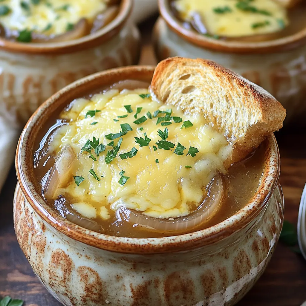- 4 large yellow onions, thinly sliced - 4 cloves garlic, minced - 4 cups beef broth or vegetable broth - 2 tablespoons olive oil - 2 tablespoons unsalted butter - 1 teaspoon sugar for caramelization - 1 teaspoon dried thyme - 1 bay leaf - Salt and pepper to taste - 1 baguette, sliced - 2 cups shredded Gruyère cheese or a mix of Gruyère and mozzarella - Fresh parsley for presentation When I make Slow Cooker French Onion Soup, I focus on great ingredients. The yellow onions bring sweetness. They cook down to a rich flavor. Garlic adds a nice touch and depth. For broth, beef broth gives a hearty taste. You can also use vegetable broth for a lighter version. Olive oil and unsalted butter help to caramelize the onions, making them soft and sweet. For variation, I often add sugar. It helps with caramelization. Dried thyme and a bay leaf add earthy notes. Salt and pepper adjust the flavor, making it just right. Toppings are key! I love using sliced baguette. It adds a nice crunch. Gruyère cheese melts beautifully on top. A mix with mozzarella gives extra creaminess. To finish, I sprinkle fresh parsley for a pop of color. This simple detail makes the dish look inviting and fresh. Start by caramelizing the onions in a skillet. Heat 2 tablespoons of olive oil and 2 tablespoons of unsalted butter over medium heat. Once the butter melts, add 4 large yellow onions, thinly sliced. Stir them often for about 15 minutes. You want them to turn golden and soft. Next, incorporate garlic and seasonings. Add 4 cloves of minced garlic, 1 teaspoon of sugar, 1 teaspoon of dried thyme, salt, and pepper. Cook this mixture for another 5 minutes. This step adds depth to the flavor. Now, transfer the mixture to the slow cooker. Pour in 4 cups of beef broth and 2 cups of water. Don’t forget to add 1 bay leaf. Stir everything to combine. Cover the slow cooker and let it work its magic. Cook on low for 6 to 8 hours. The onions will become very soft, and the flavors will meld beautifully. Once the soup is ready, remove the bay leaf. Taste it and adjust the seasoning if needed. Now, preheat your oven's broiler. To serve, ladle the soup into oven-safe bowls. Top each bowl with sliced baguette and 2 cups of shredded Gruyère cheese. Place them under the broiler for 2 to 3 minutes. Watch closely until the cheese melts and bubbles. For a lovely presentation, sprinkle freshly chopped parsley on top. You can also serve extra toasted baguette slices on the side for that delightful crunch. Enjoy your savory slow cooker French onion soup! To make great caramelized onions, you need to control the heat. I recommend medium heat. This setting helps the onions cook slowly. It prevents burning while allowing them to turn soft and sweet. The timing is also critical. Aim for about 15 to 20 minutes of cooking. This gives the onions time to develop their rich flavor. When using a slow cooker, set it to low heat. This allows the flavors to blend well over time. Cook the soup for 6 to 8 hours. The longer cooking time softens the onions nicely. Always cover the cooker. This keeps moisture in and helps the onions cook evenly. Before serving, always taste your soup. This step helps you check the flavor. If it needs more salt or pepper, add it now. You can also adjust the sweetness by adding a bit more sugar if needed. Customizing your soup makes it truly your own! {{image_2}} You can easily make this soup vegetarian or vegan. Just swap the beef broth for vegetable broth. This change keeps the soup rich in flavor without meat. For cheese, use a vegan cheese alternative. There are many options that melt well, giving you that creamy texture you want. Feel free to get creative with the herbs and spices. You can add rosemary or oregano for a unique twist. Both herbs bring a fresh taste that brightens the soup. If you want more depth, add another bay leaf while cooking. Each herb adds its own charm to the dish. The toppings can change how your soup tastes. Instead of Gruyère, try fontina or provolone cheese. They melt beautifully and offer different flavors. You can also add croutons for crunch. Fresh chives or parsley can brighten the dish and add color. These small changes can make your soup feel new and exciting! To store your leftover soup, let it cool first. Then, pour it into airtight containers. Make sure to leave some space at the top for expansion. Label the containers with the date. Place them in the fridge for up to five days. This helps keep the soup fresh and tasty. If you want to freeze the soup, do it in small batches. Use freezer-safe containers or bags. Leave some space at the top for expansion. The soup can stay frozen for up to three months. When ready to eat, thaw it in the fridge overnight. To reheat, gently warm the soup on the stove over low heat. Stir often to prevent sticking. You can also use the microwave. Heat in short bursts, stirring in between. Once hot, serve with fresh baguette and cheese. Enjoy your warmed soup as if it were fresh! Yes, you can use different types of onions. I often use yellow onions because they caramelize well. Their sweetness adds depth to the soup. Sweet onions, like Vidalia, are another great choice. They are milder and can enhance the flavor. If you want a stronger taste, red onions work too. Just remember, each onion type changes the soup's taste a bit. You can store French onion soup for about three to four days in the fridge. Make sure to let it cool before you put it in a container. Keep it in an airtight container to prevent any odors. If you want to store it longer, freezing is a good option. It stays good for about three months. Just make sure to leave out the cheese until you reheat it. Absolutely! Making this soup ahead of time is a great idea. You can prepare it a day or two before you plan to serve it. Just cook the soup and store it in the fridge. When you're ready, reheat it on the stove. If you want, you can broil the cheese on top right before serving. This way, you get tha