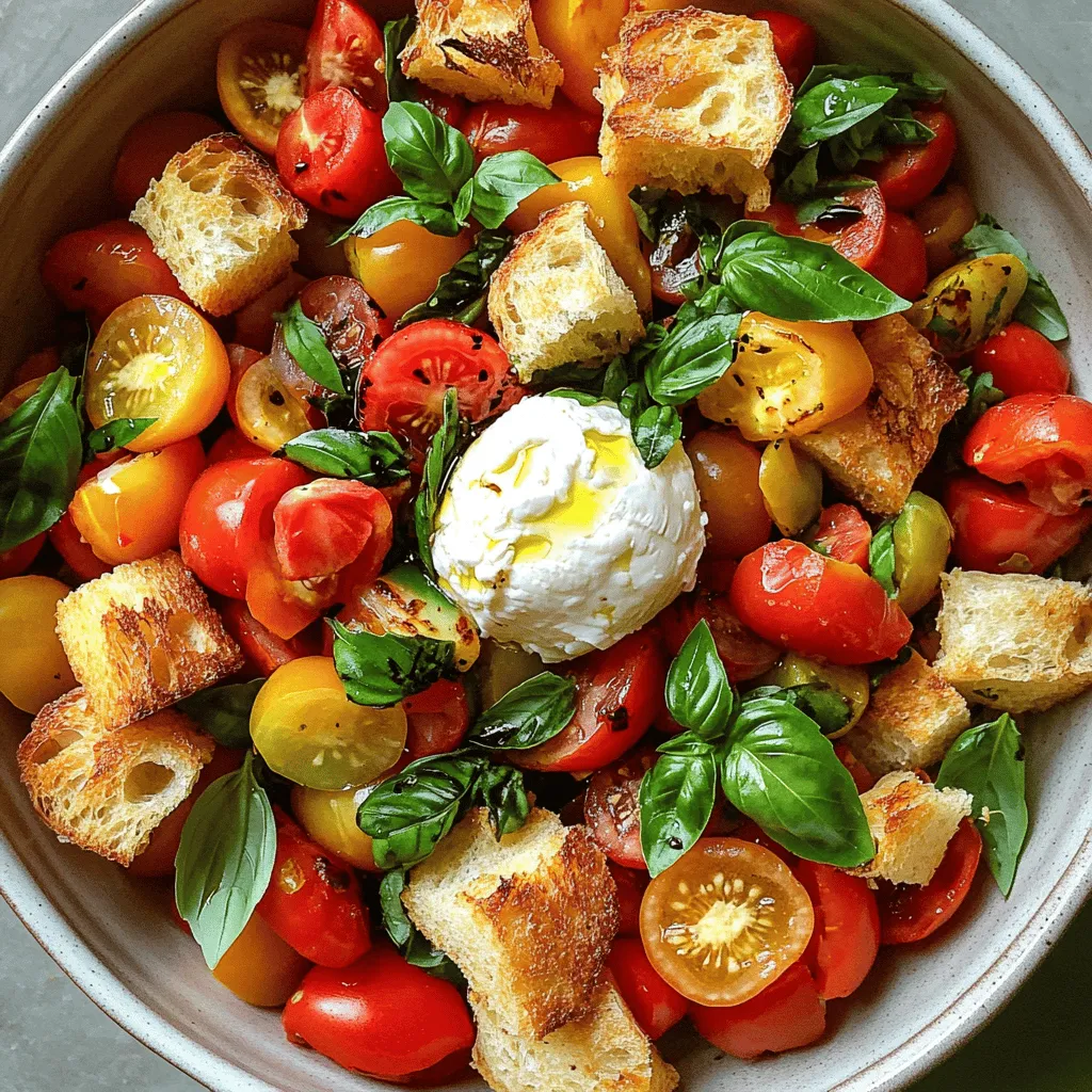 Tomato Burrata Panzanella Salad shines with fresh ingredients. I love using mixed heirloom tomatoes. Their colors and sizes make the dish pop. You need ripe tomatoes for the best flavor. Burrata cheese adds creaminess. It breaks apart easily and melts into the salad. Fresh basil leaves bring a fragrant touch.
