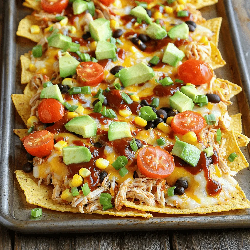 Layering is key for flavor. Start with a base of tortilla chips. Spread the chips evenly on your sheet pan. This helps all toppings sit nicely. Add BBQ chicken next. Then sprinkle black beans and corn. Top with cheese for a tasty melt.