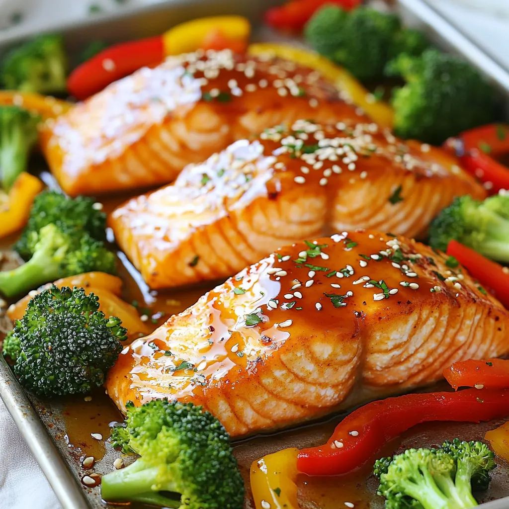 A delicious and easy sheet pan meal featuring salmon fillets glazed with honey garlic sauce, served with roasted broccoli and red bell pepper.