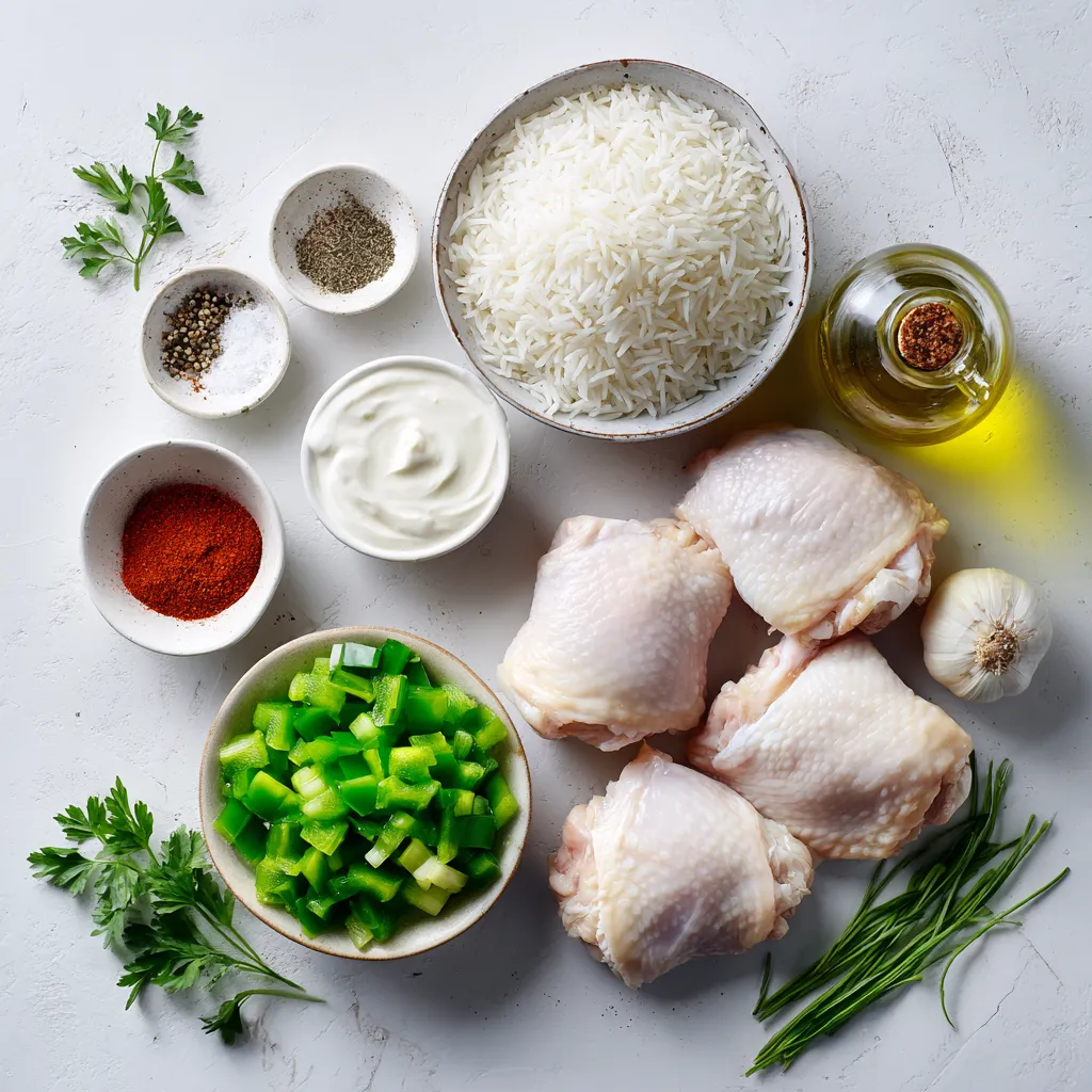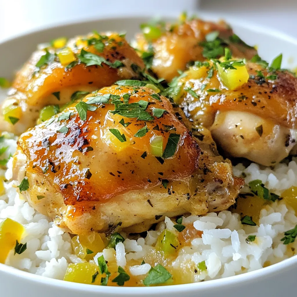 A comforting dish featuring seared chicken thighs cooked with rice and vegetables in a creamy sauce.