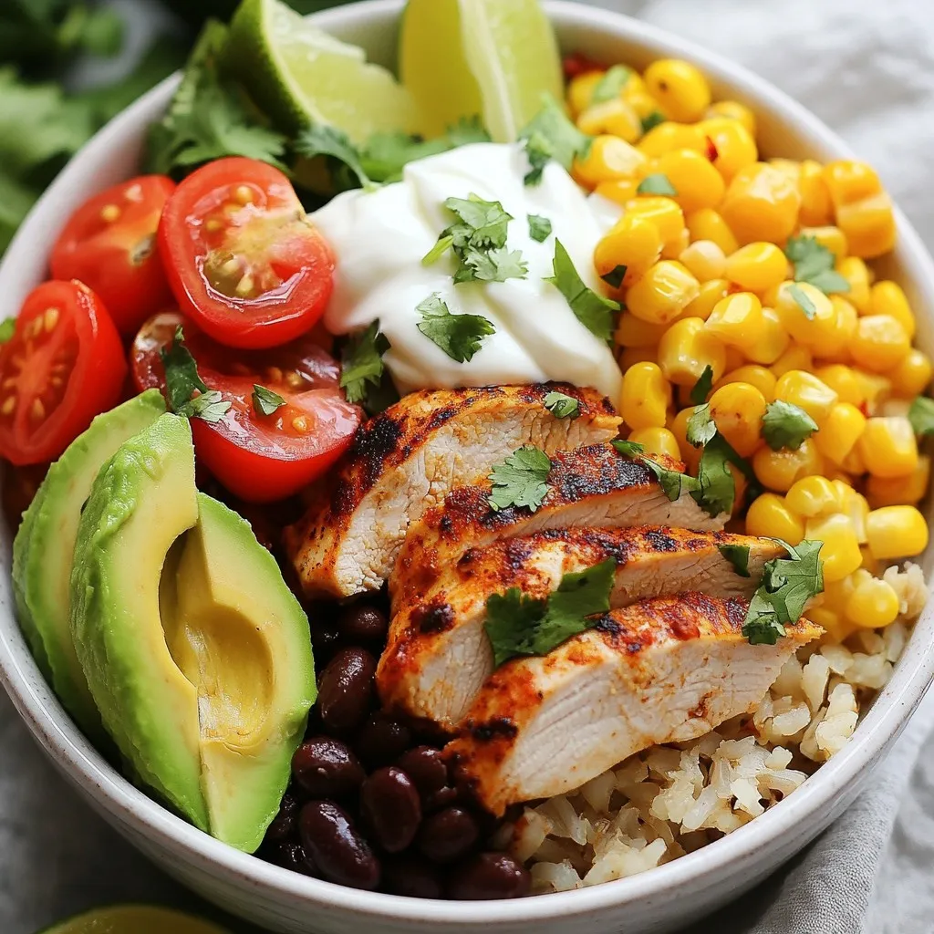 Now it is time to assemble your bowls. Start with a base of the cooked brown rice or quinoa. Place sliced chicken on top. Then, add black beans, sautéed bell peppers, corn, avocado slices, and halved cherry tomatoes. You can garnish with fresh cilantro and lime wedges. If you like, add a dollop of sour cream or Greek yogurt on top. Enjoy your delicious Southwest Chicken Burrito Bowls!