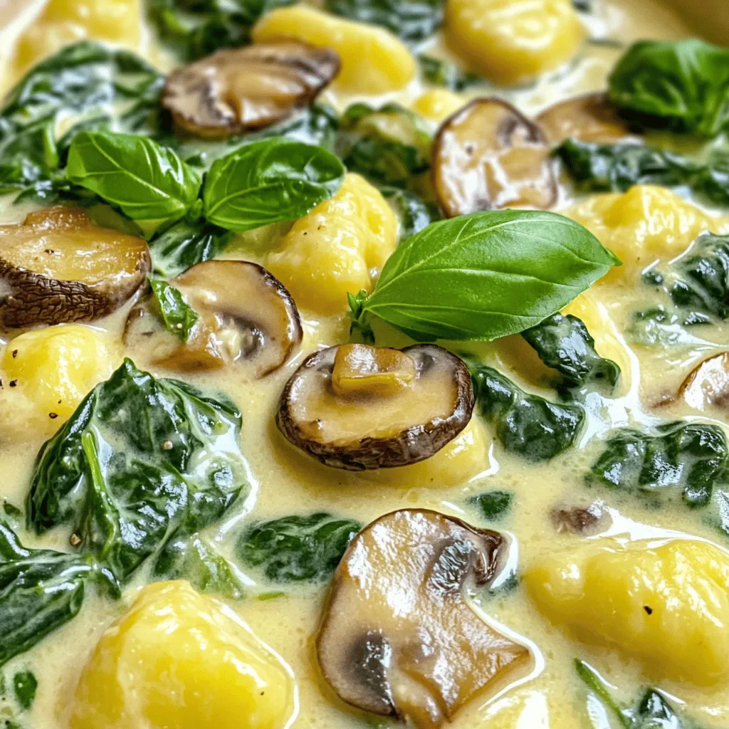 Gather these ingredients before you start cooking. The potato gnocchi is the star here, providing a soft and fluffy base. Fresh spinach adds color and nutrients, while mushrooms bring a rich umami taste. The garlic will give your dish a lovely aroma. Heavy cream makes the sauce creamy and smooth, and Parmesan cheese adds a salty kick. Olive oil is key for sautéing, and don’t forget the salt and pepper to enhance the flavors. If you want a warm spice, add nutmeg. Finally, fresh basil leaves will make your dish look pretty and add a fresh taste.