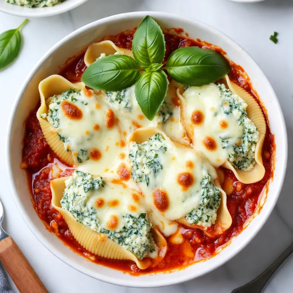 A delicious baked pasta dish filled with a creamy spinach and ricotta mixture, topped with marinara and mozzarella.