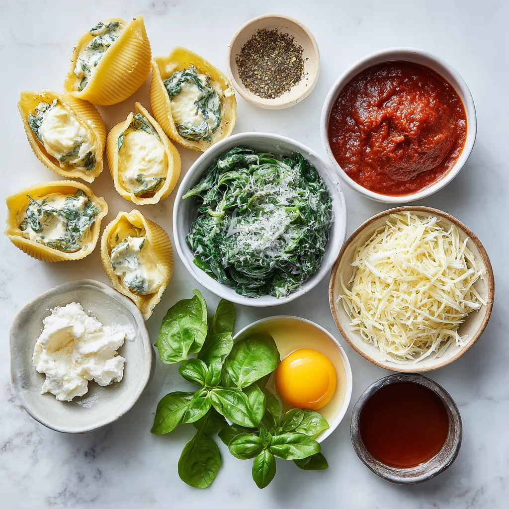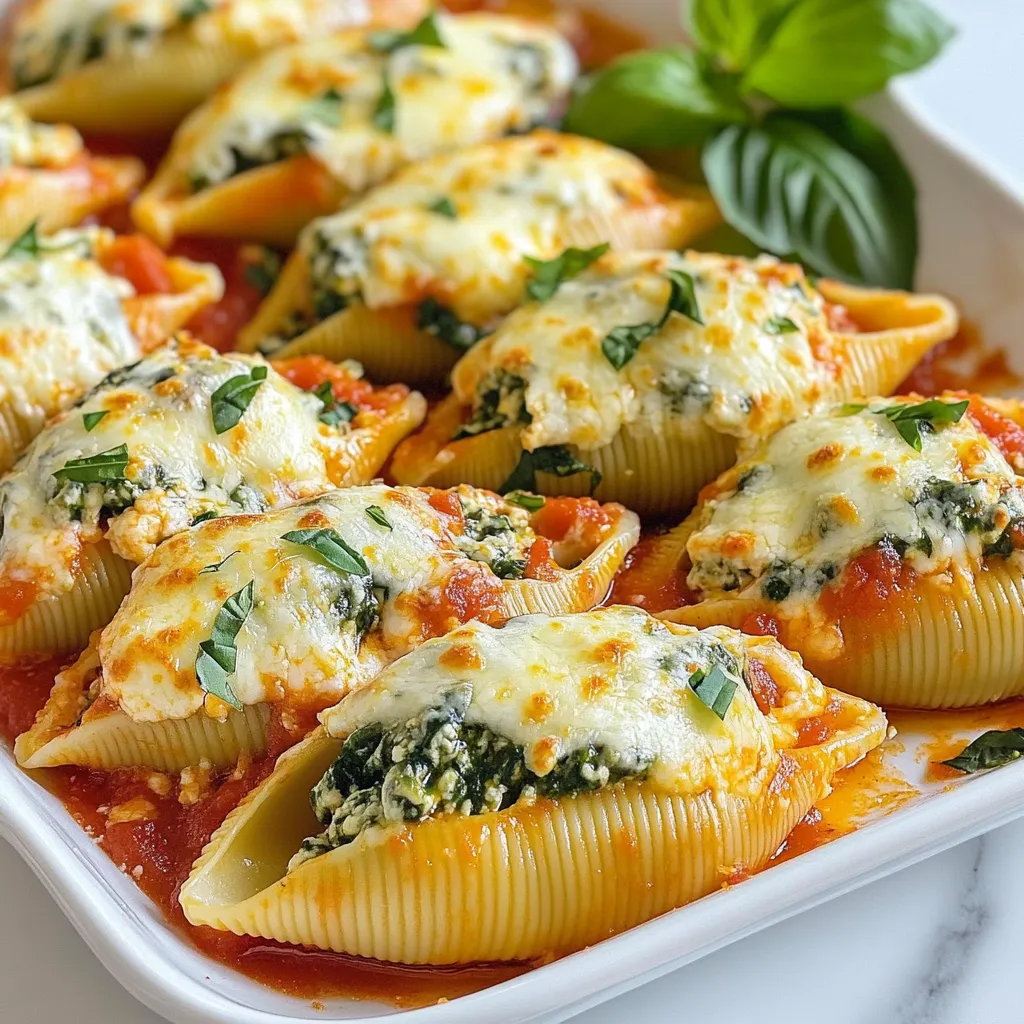 Delicious jumbo pasta shells stuffed with a creamy ricotta and spinach filling, topped with marinara sauce and melted mozzarella.