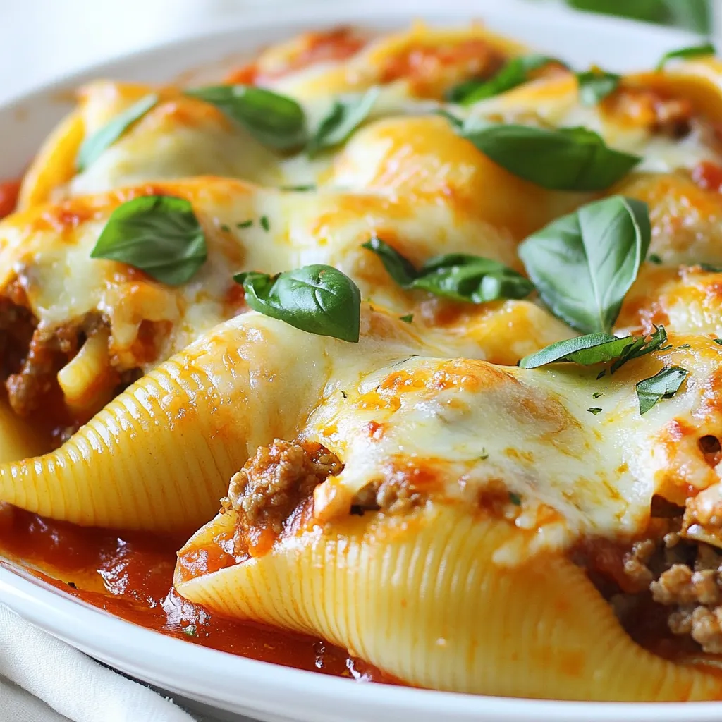 A hearty dish of jumbo pasta shells stuffed with a savory beef and cheese mixture, topped with marinara sauce and melted mozzarella.