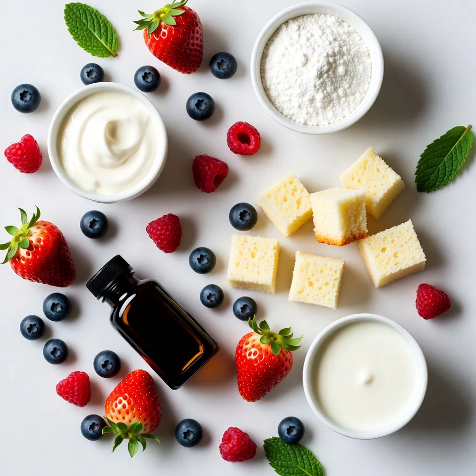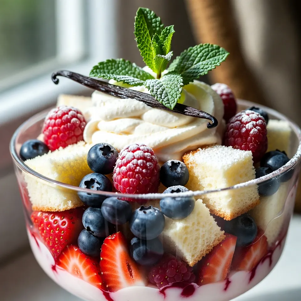 For a Summer Berry Trifle, I love using a mix of strawberries, blueberries, and raspberries. These berries bring color and taste to the dish. Fresh berries are best, but frozen berries work too. Just make sure to thaw them before use. If you use frozen berries, they might be softer. So, they may look less pretty, but they still taste great. The cream mixture is key to a rich trifle. I use 1 cup of heavy whipping cream for a nice, thick texture. Add in 1/2 cup of powdered sugar and 1 teaspoon of vanilla extract. This blend makes a sweet and smooth cream. Whipping the cream until it forms stiff peaks is crucial. This step gives your trifle a light and airy feel. For the cake, you can choose between store-bought or homemade vanilla sponge cake. A store-bought cake saves time, but a homemade cake adds a personal touch. Cut the cake into cubes for easy layering. When it comes to yogurt, I recommend plain vanilla yogurt. It complements the sweetness of the cream and berries well. {{ingredient_image_1}} To make the cream for your trifle, first, you need to whip it well. Stiff peaks are key. Stiff peaks mean that your cream holds its shape well. This makes your trifle look great and taste amazing. Here’s how to achieve that: - Use cold heavy whipping cream. Cold cream whips better. - Start on low speed to mix in powdered sugar and vanilla extract. - Gradually increase the speed until the cream thickens. - Stop when you see stiff peaks. If you whip too long, your cream can turn into butter. Keep an eye on it! The order of layers in your trifle matters. It helps build flavor and texture. Here’s the best way to layer: 1. Start with sponge cake cubes at the bottom. This is your base. 2. Next, add a layer of yogurt. Spread it evenly. 3. Follow with a layer of berries. Mix different berries for color. 4. Then, add half of your whipped cream. Spread it smoothly. Repeat these layers. Finish with whipped cream on top. This creates a beautiful look. For even distribution, use a spatula when spreading. Make sure each layer is nice and even. This helps every bite taste great. Chilling your trifle is important. It lets the flavors blend together. Plus, it helps the cake soak up moisture. For best results, chill it for at least 2 hours. If you have time, chilling it longer is even better. This gives the trifle a nice, firm texture. Cover it with plastic wrap before placing it in the fridge. This keeps it fresh and ready to serve. Choose a clear glass dish to show off the layers. It makes the trifle look fancy. A trifle bowl is perfect for this. You can use a large spoon to scoop out the layers. This way, everyone sees the colors as you serve. To add a touch of flair, use fresh mint leaves as a garnish. They give a pop of green and a fresh scent. You can also scatter some extra berries on top. This adds a lovely look and taste. Yes, you can prepare the trifle in advance! This dessert tastes even better after chilling. Make it a day ahead for best flavor. Just remember to cover it tightly with plastic wrap. For storage, keep the trifle in the fridge. It stays fresh for up to three days. If you see any signs of spoilage, like changes in texture or smell, it's time to toss it. To keep the cake from getting soggy, layer carefully. Add the sponge cake first. This helps soak up some moisture without falling apart. Balancing the flavors is key too. Use a mix of sweet berries with tangy yogurt. This gives a nice contrast that keeps each bite interesting. A bit of sweetness from the cream also helps. Pro Tips Fresh Berries: Always use the freshest berries available for the best flavor and texture. Look for vibrant colors and firm fruit. Layering Technique: For a beautiful presentation, ensure each layer is evenly distributed and visible. Use a clear glass dish to showcase the layers. Chilling Time: Allow the trifle to chill for at least 2 hours to let the flavors meld and the sponge cake to absorb moisture for a softer texture. Garnish Wisely: When garnishing, use fresh mint leaves and a few extra berries for a pop of color. This enhances both the look and taste of the trifle. {{image_2}} To make your trifle fit special diets, you can easily adjust the recipe. - Gluten-free sponge cake option: Use gluten-free cake mix or almond flour for the sponge. This keeps the trifle light and fluffy without the gluten. - Dairy-free cream alternatives: Swap heavy cream for coconut cream or a dairy-free whipped topping. This still gives you that creamy texture while keeping it dairy-free. Adding new flavors can lift your trifle to a new level. - Incorporating citrus flavors: A splash of lemon or orange zest in the cream adds a bright note. It enhances the fresh berries beautifully. - Other fruit options: Try peaches, kiwi, or mango. Mix them in with your berries for extra flavor and color. They can create a fun twist on the classic summer berry trifle. You can change the trifle's look and taste for different seasons or events. - Seasonal adaptations: Use fall fruits like apples and pears in autumn. For winter, consider pomegranate seeds or citrus fruits. Each season can inspire a new version of the trifle. - Holiday-themed variations: For Christmas, add crushed peppermint to the cream. In summer, focus on bright fruits and fresh herbs for a festive touch. These themes make each trifle a special treat. You can store summer berry trifle in the fridge for up to three days. Keep it covered to avoid drying out. Look for signs of spoilage. If the berries turn mushy or the cream separates, it’s time to toss it. I do not recommend freezing summer berry trifle. The cream and berries do not freeze well. If you must freeze it, layer the sponge cake and yogurt only. Freeze these layers separately. Thaw them in the fridge overnight before serving. Leftover trifle is a treat! You can layer it into parfaits for a fun twist. Use it in smoothies for a sweet, creamy drink. You can even mix it into pancakes or waffles for a berry boost. A Summer
