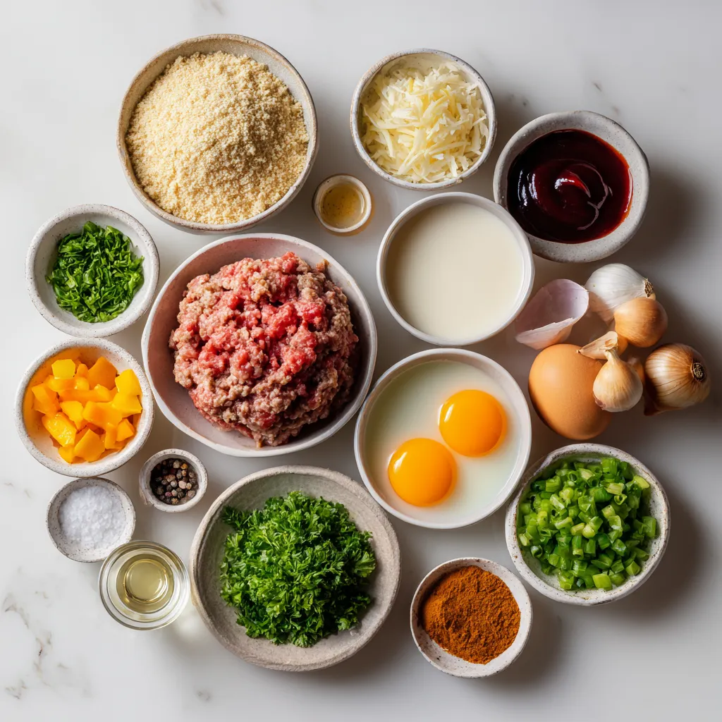 These main ingredients create a hearty and tasty base for the meatloaf. The mix of ground beef and turkey gives it a nice balance of flavor and texture. Chopped onion and bell pepper add sweetness and crunch. Garlic adds depth, and the eggs and milk help bind everything together.