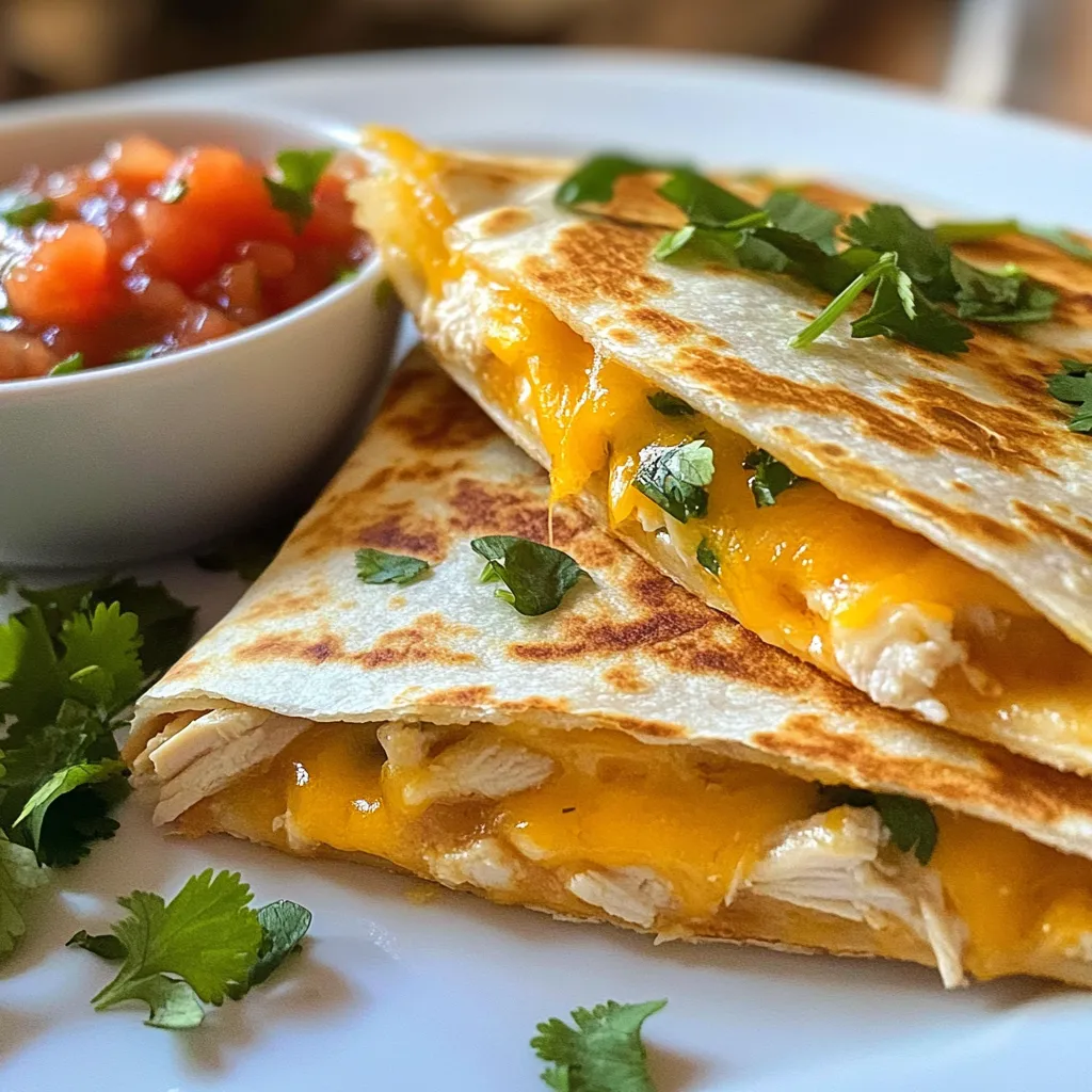 To make this quesadilla from scratch, start with cooked chicken. Shred about 2 cups of it. In a bowl, mix the shredded chicken with ½ cup of softened cream cheese, ½ teaspoon of garlic powder, ½ teaspoon of onion powder, and 1 teaspoon of taco seasoning. Mix until everything blends well. Take a large flour tortilla and spread a quarter of the chicken mix over one half. Add ⅓ cup of shredded cheddar cheese on top. Fold the tortilla in half. Heat 1 tablespoon of olive oil in a skillet over medium heat. Cook the quesadilla for 2-3 minutes until golden. Flip it and cook for another 2-3 minutes. Cut into wedges and enjoy with salsa.