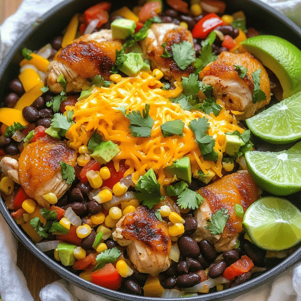Once everything is heated and the flavors meld, sprinkle one cup of shredded cheddar cheese on top. Cover the skillet and let it sit for about 2 to 3 minutes. This melts the cheese perfectly. When done, remove from heat and add fresh cilantro for garnish. Serve your Tex-Mex chicken skillet right away with avocado slices and lime wedges on the side. Enjoy this colorful and tasty meal that is quick to make!