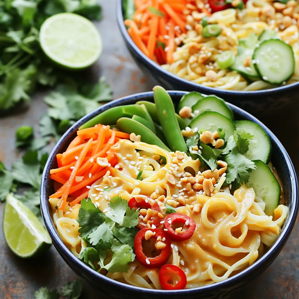 Now, it’s time to serve. Divide the Thai peanut noodles into bowls. For extra flair, sprinkle crushed peanuts and sesame seeds on top. If you want, add a lime wedge on the side. This gives a fresh kick that brightens the dish. Enjoy your colorful and tasty meal!