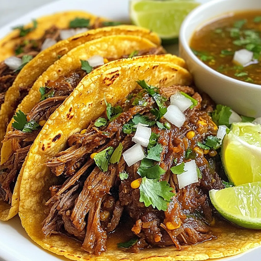 Serve birria tacos with fresh cilantro and diced onion on top. These add freshness and crunch. Lime wedges are a must for squeezing over the tacos. You can also serve a bowl of the rich broth for dipping. This enhances the birria experience. Try adding pickled onions for an extra kick. For a fun twist, pair the tacos with Mexican rice or beans.