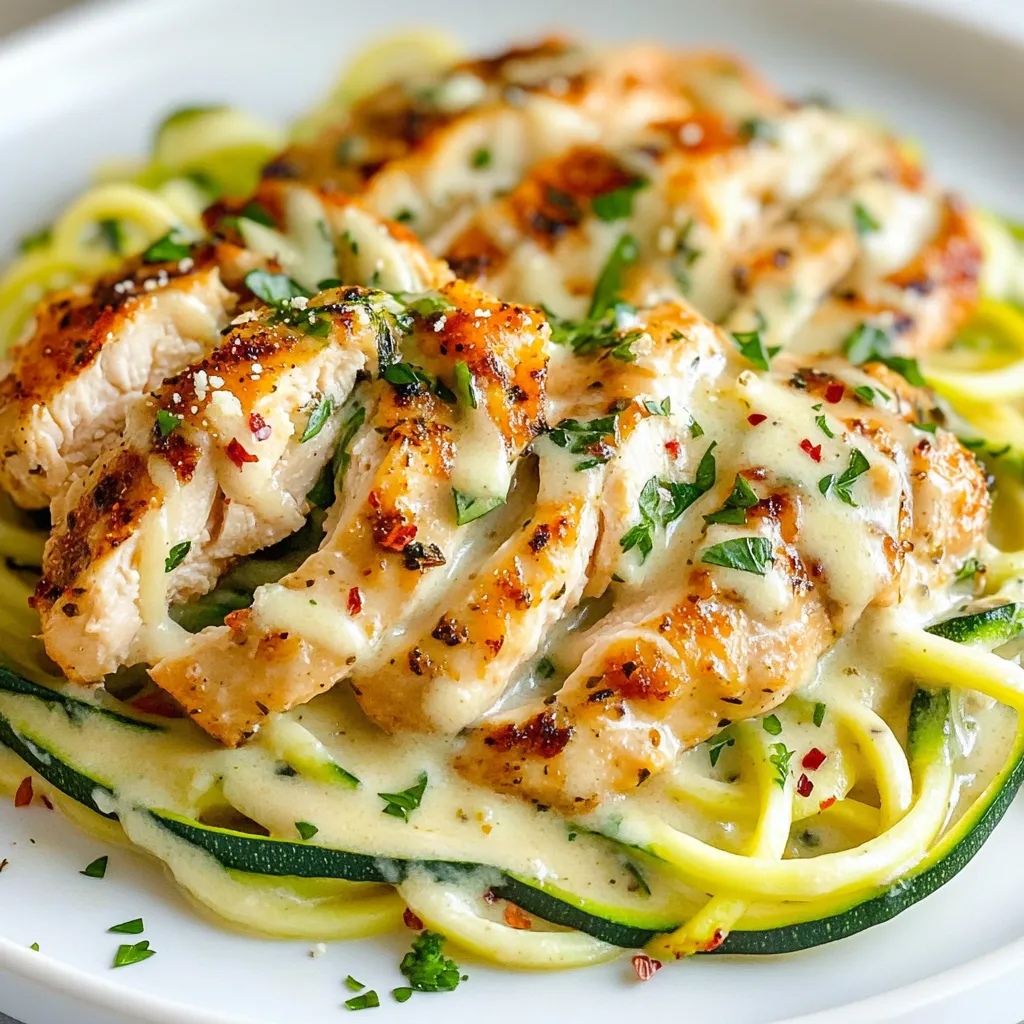 A creamy and flavorful chicken Alfredo dish made with zucchini noodles for a lighter twist.